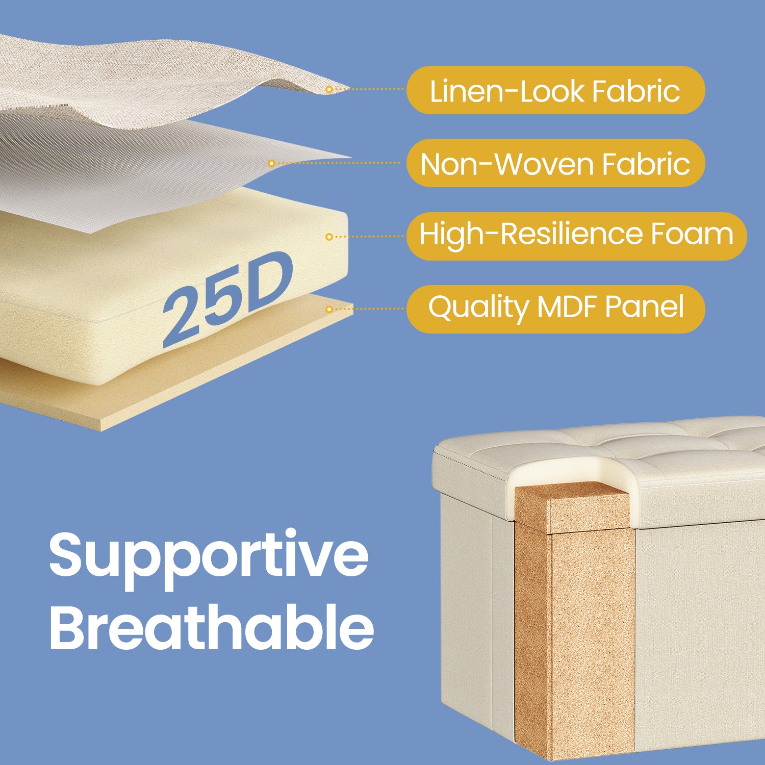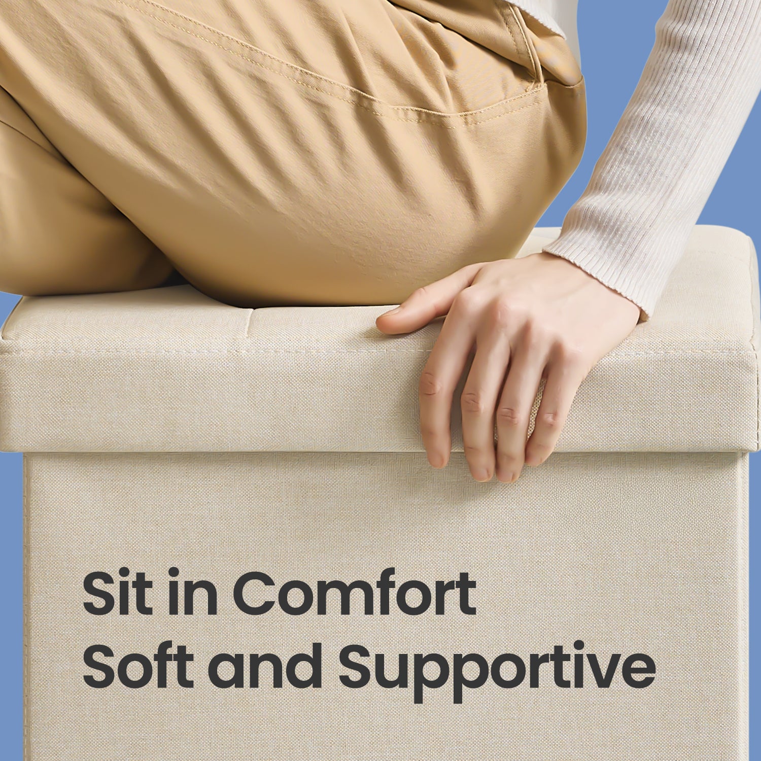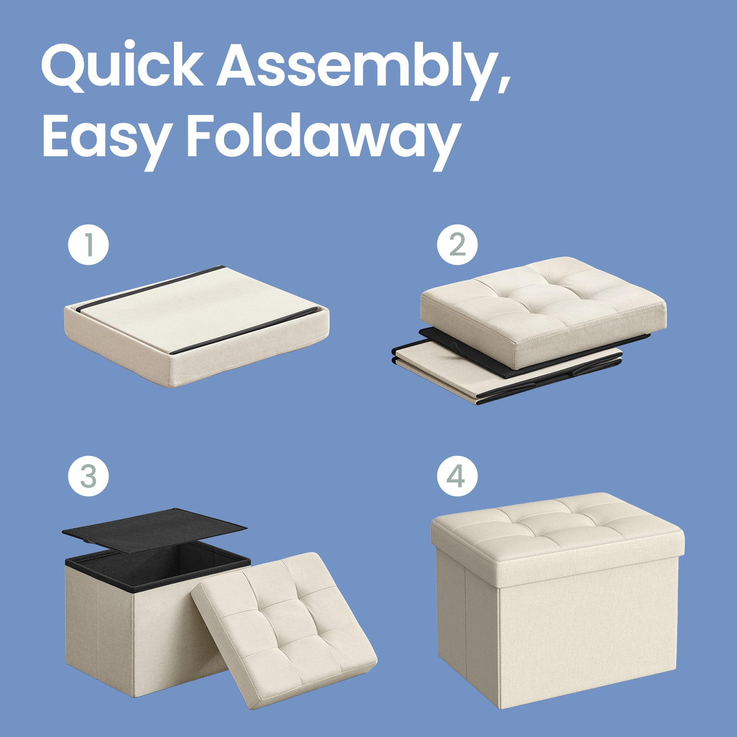 Foldable Storage Ottoman, 8 Gallon Storage, 286lb Capacity, Tufted Linen Design, Multi-Functional for Living Room, Bedroom, Cream White