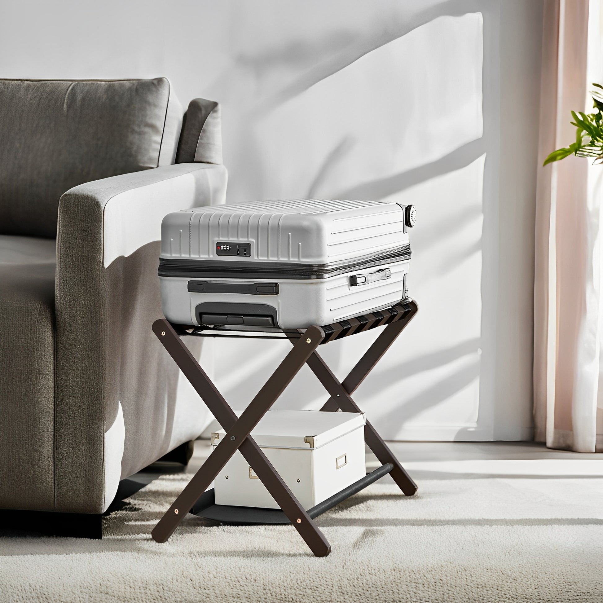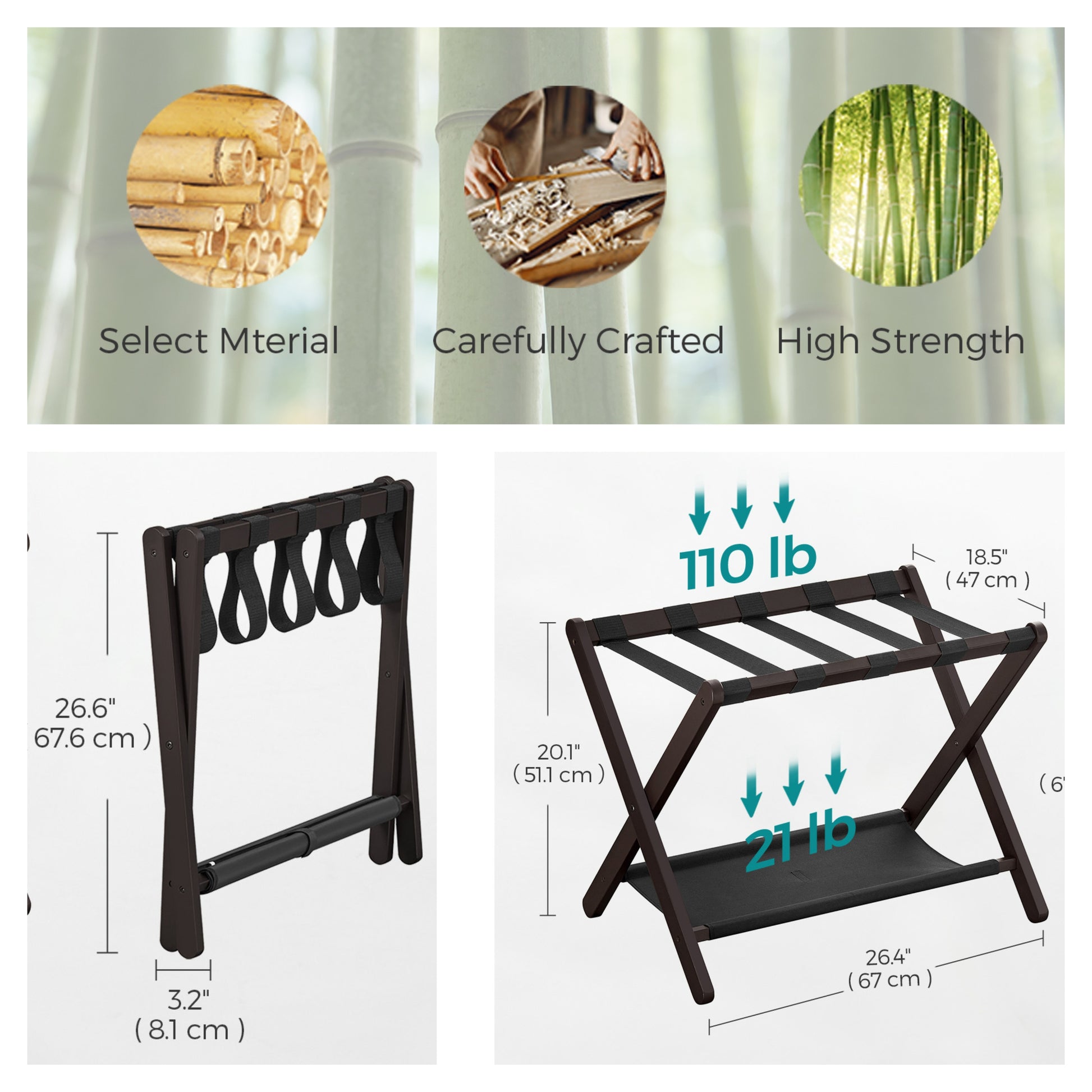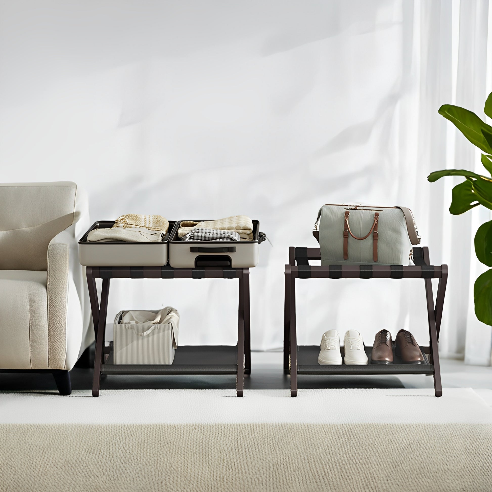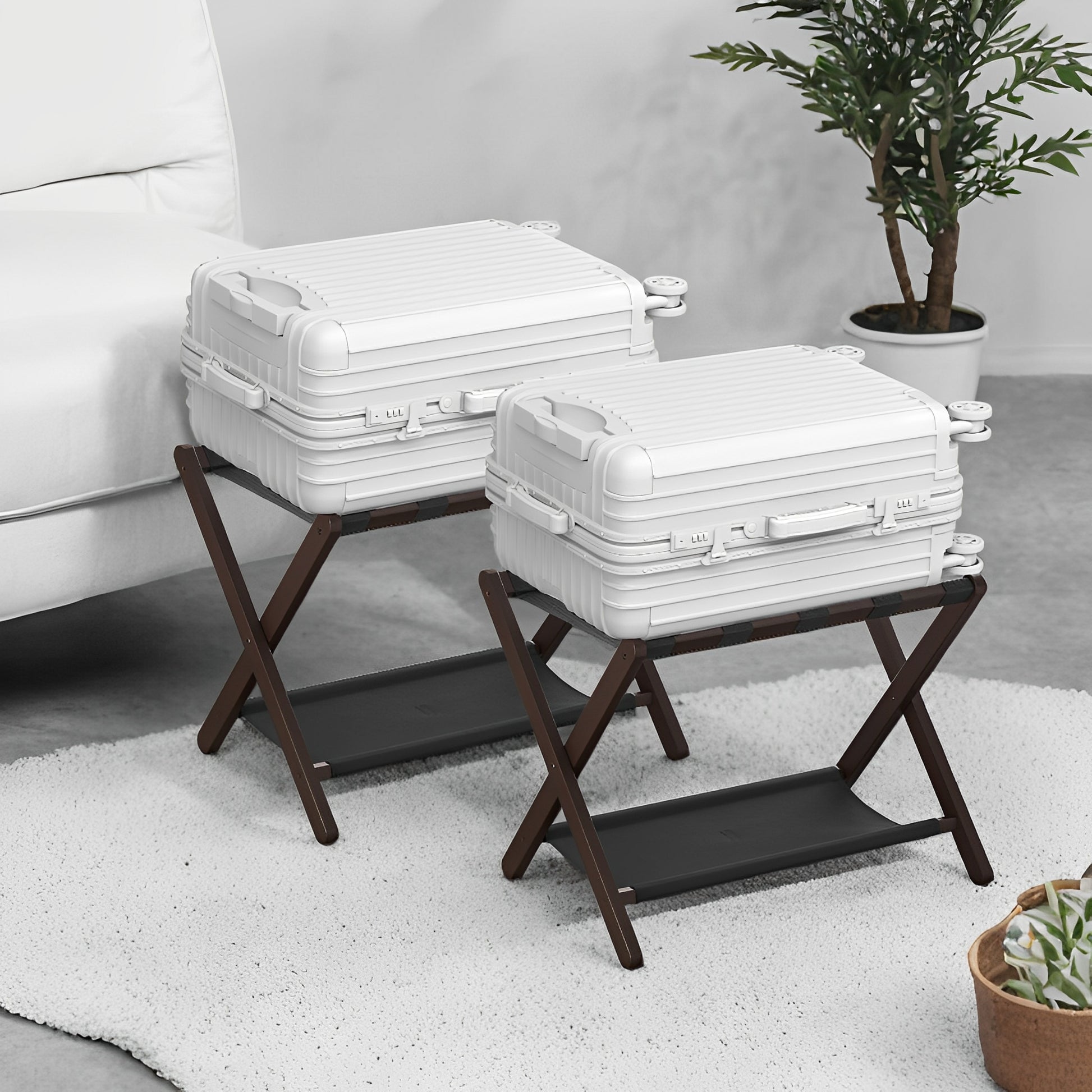 Folding Luggage Rack Set of 2, Heavy-Duty Suitcase Stand with Storage Shelf, for Hotel,Guest Room,Bedroom, Holds 131 lb, Space-Saving Design, Chestnut Brown