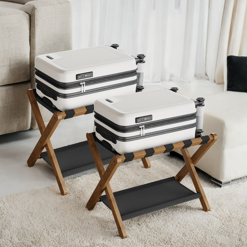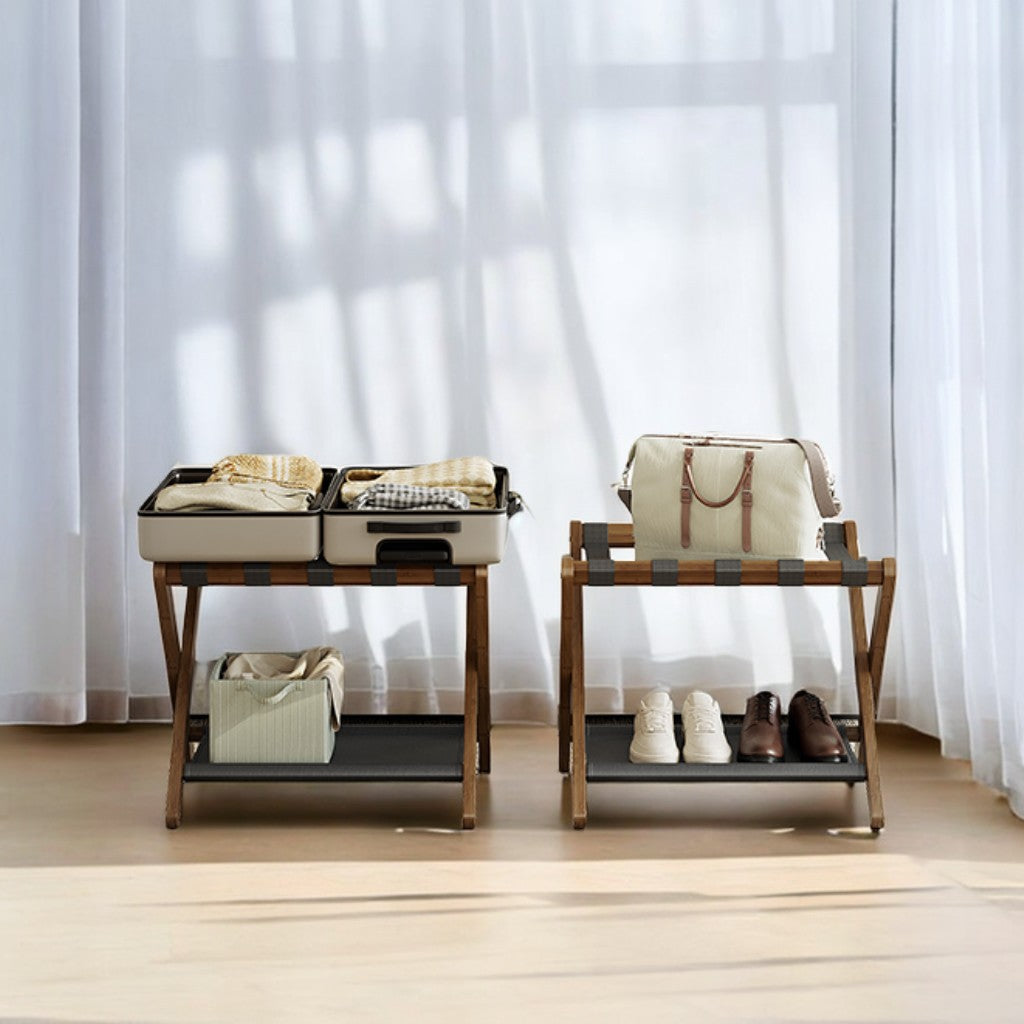 Folding Luggage Rack Set of 2, Heavy-Duty Suitcase Stand with Storage Shelf, Supports 131 lb, Space-Saving Design for Hotel, Bedroom & Guest Room, Walnut Brown
