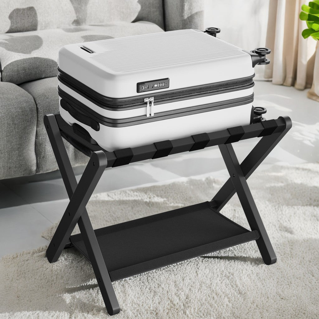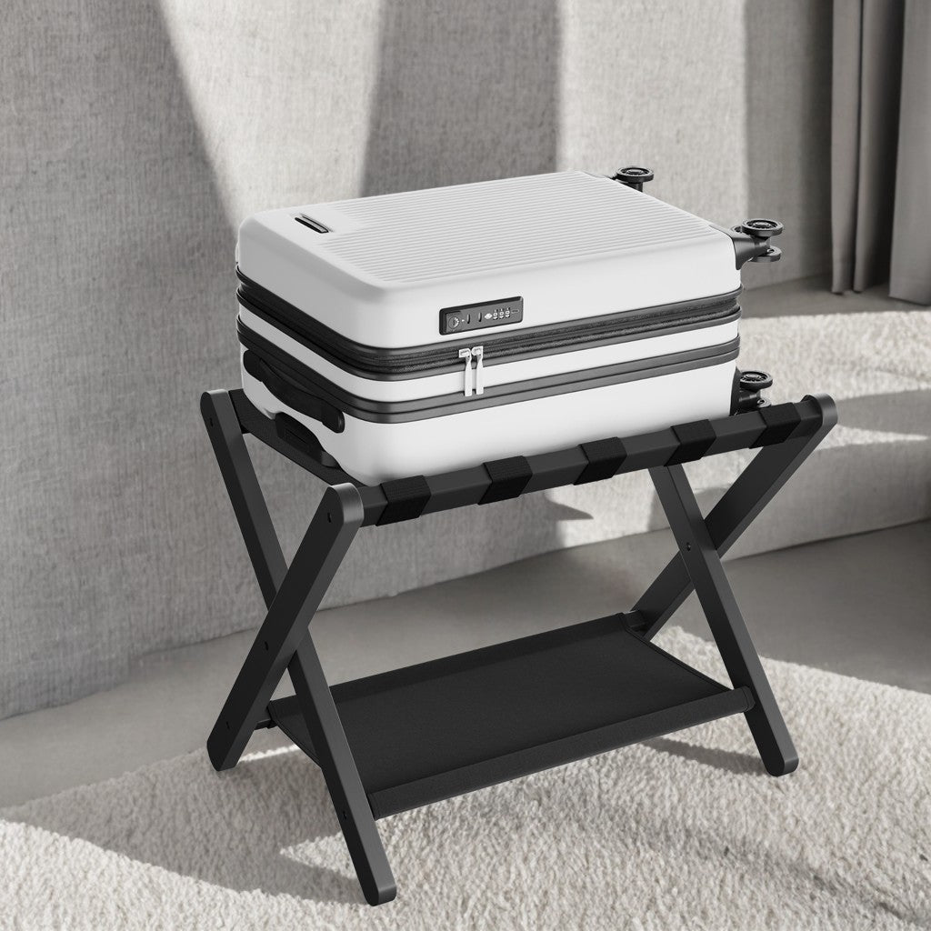 Folding Luggage Rack with Storage Shelf, Heavy-Duty Bamboo Frame & Nylon Straps, Holds 131 lb, for Hotel,Bedroom,Guest Room, Space-Saving Design, Classic Black