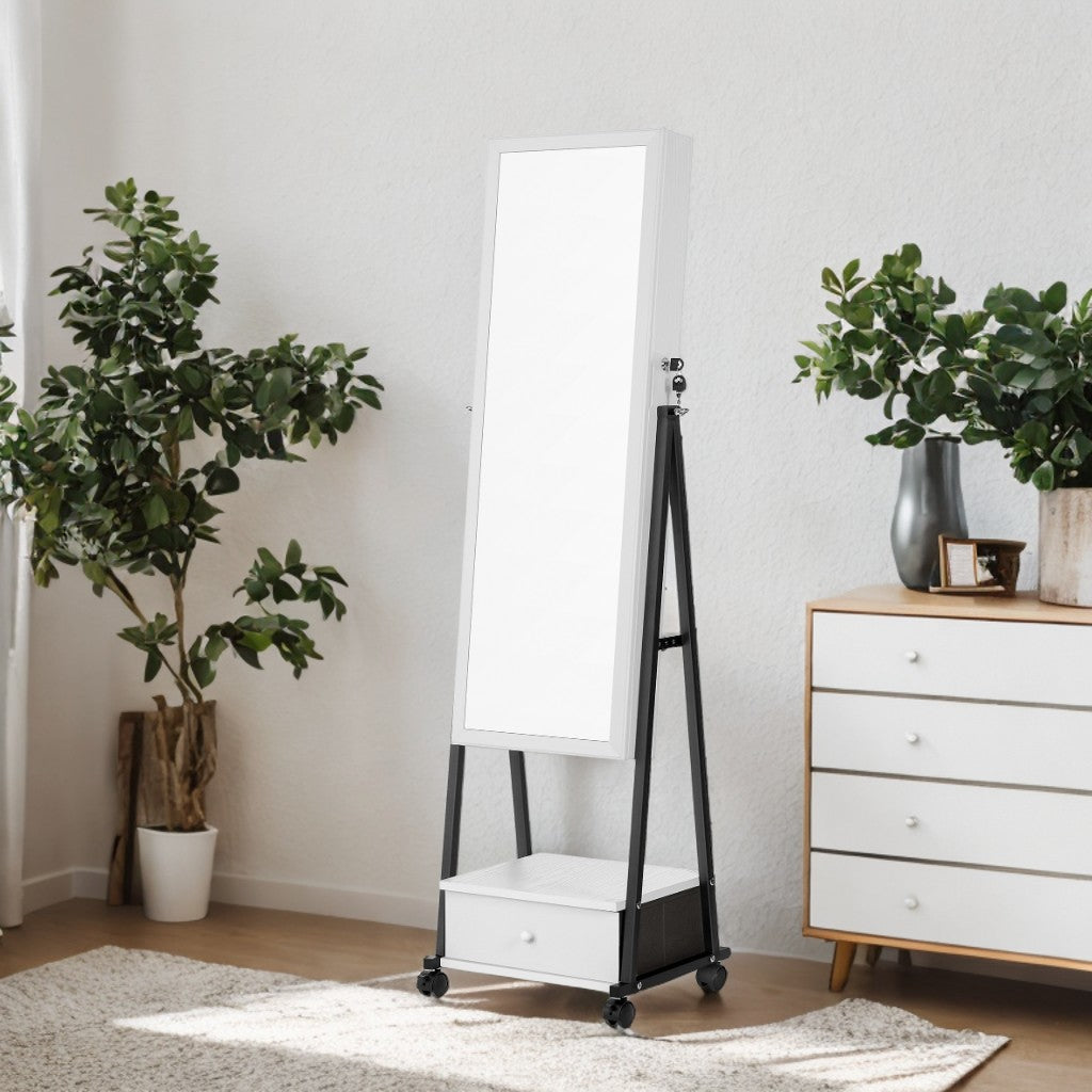 Full-Length Mirror Jewelry Armoire with Lockable Storage, 92 Earring/36 Ring Slots, Rolling Wheels, Distressed White and Black