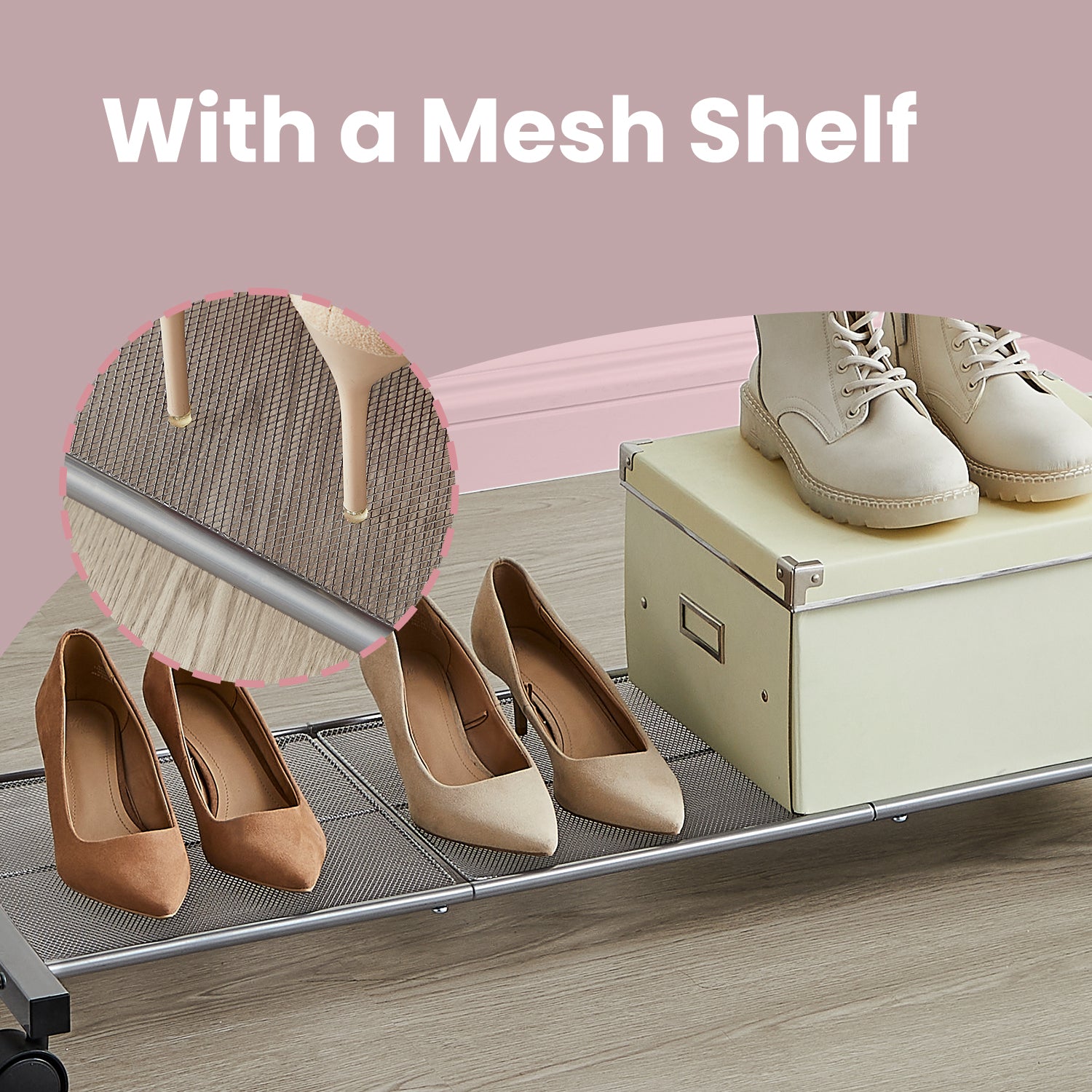 Versatile Storage Shelf – The sturdy mesh base holds shoes, bins, or accessories (up to 22 lbs), with tight spacing to keep even delicate heels secure.