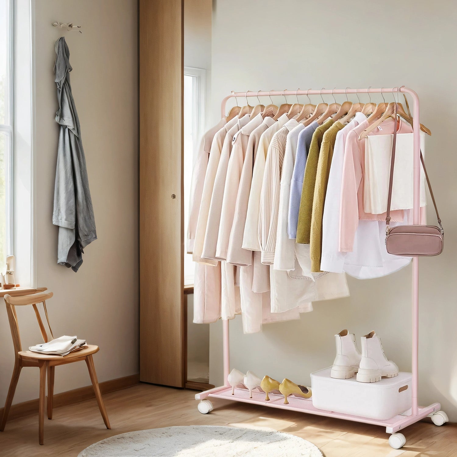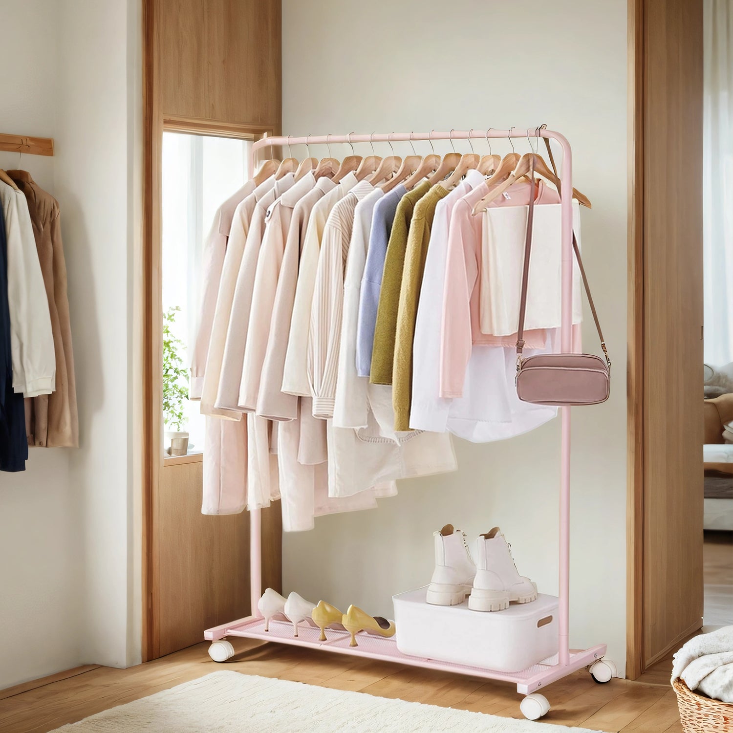Heavy-Duty Mobile Garment Rack with Dense Mesh Shelf – 25.4mm Steel Frame, 110lb Capacity, 2 Locking Wheels, Holds 40+ Clothes, Pink