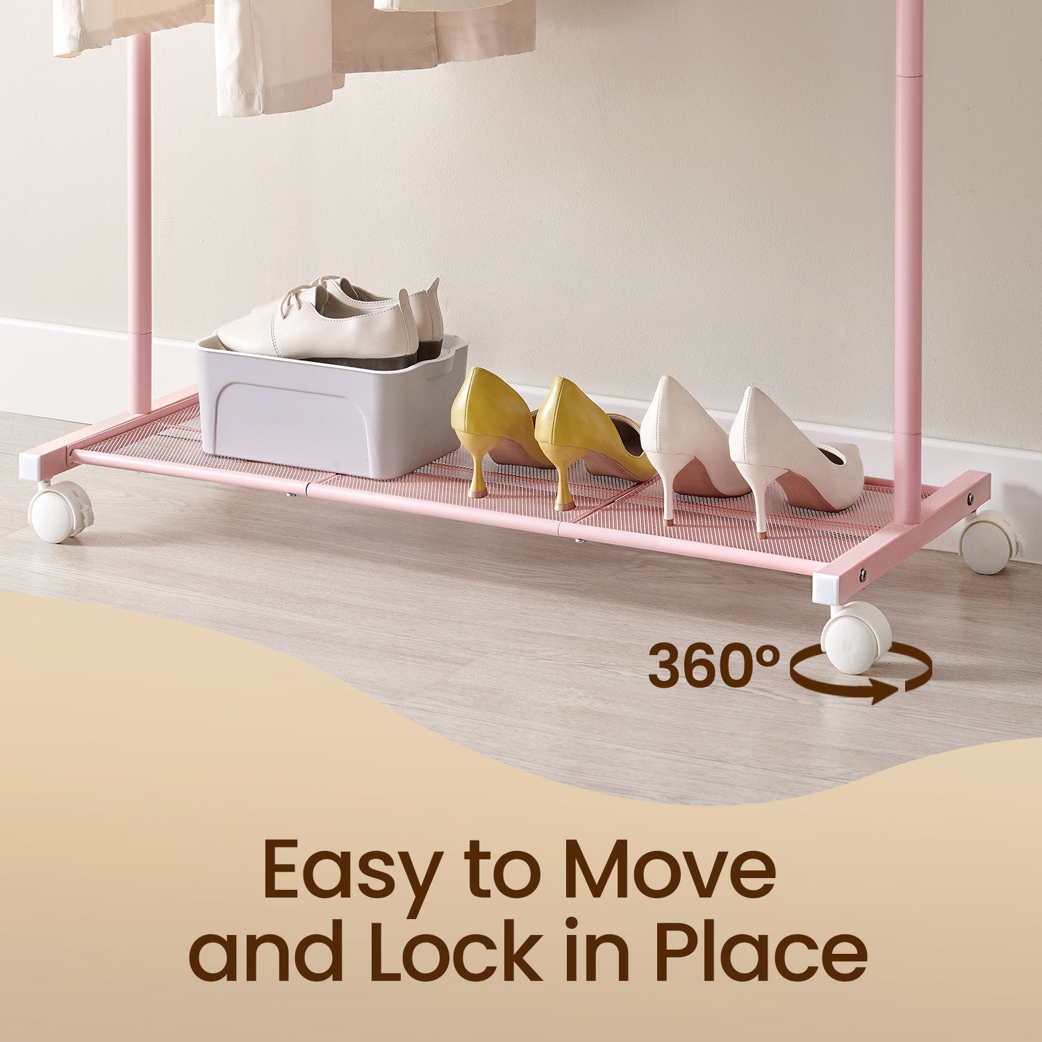 Roll & Lock Mobility – Effortlessly glide this rack anywhere with 4 smooth-rolling casters, including 2 locking wheels for instant stability when needed.