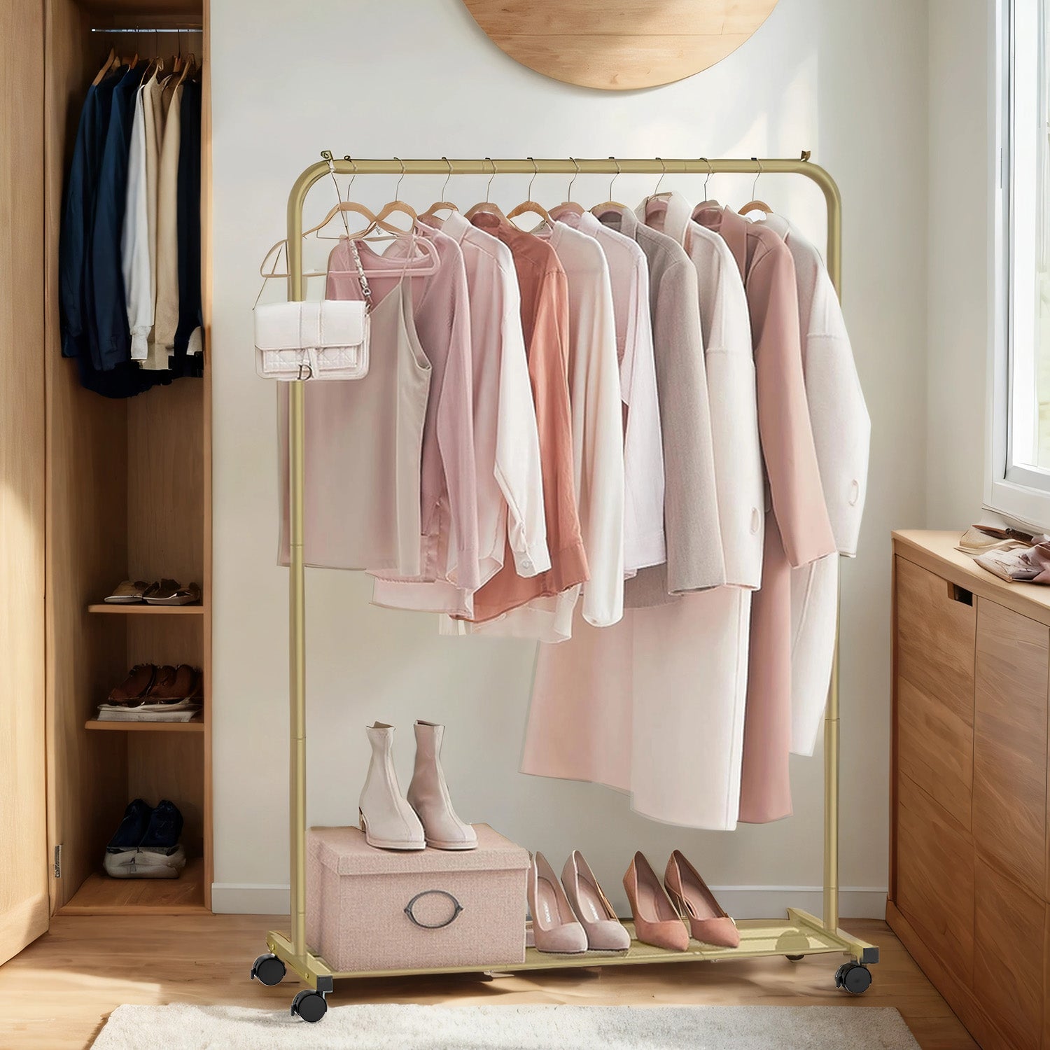 Roll & Lock Mobility – 4 smooth-rolling casters (2 locking) let you glide this rack anywhere—bedroom, closet, or entryway—then secure it in place.