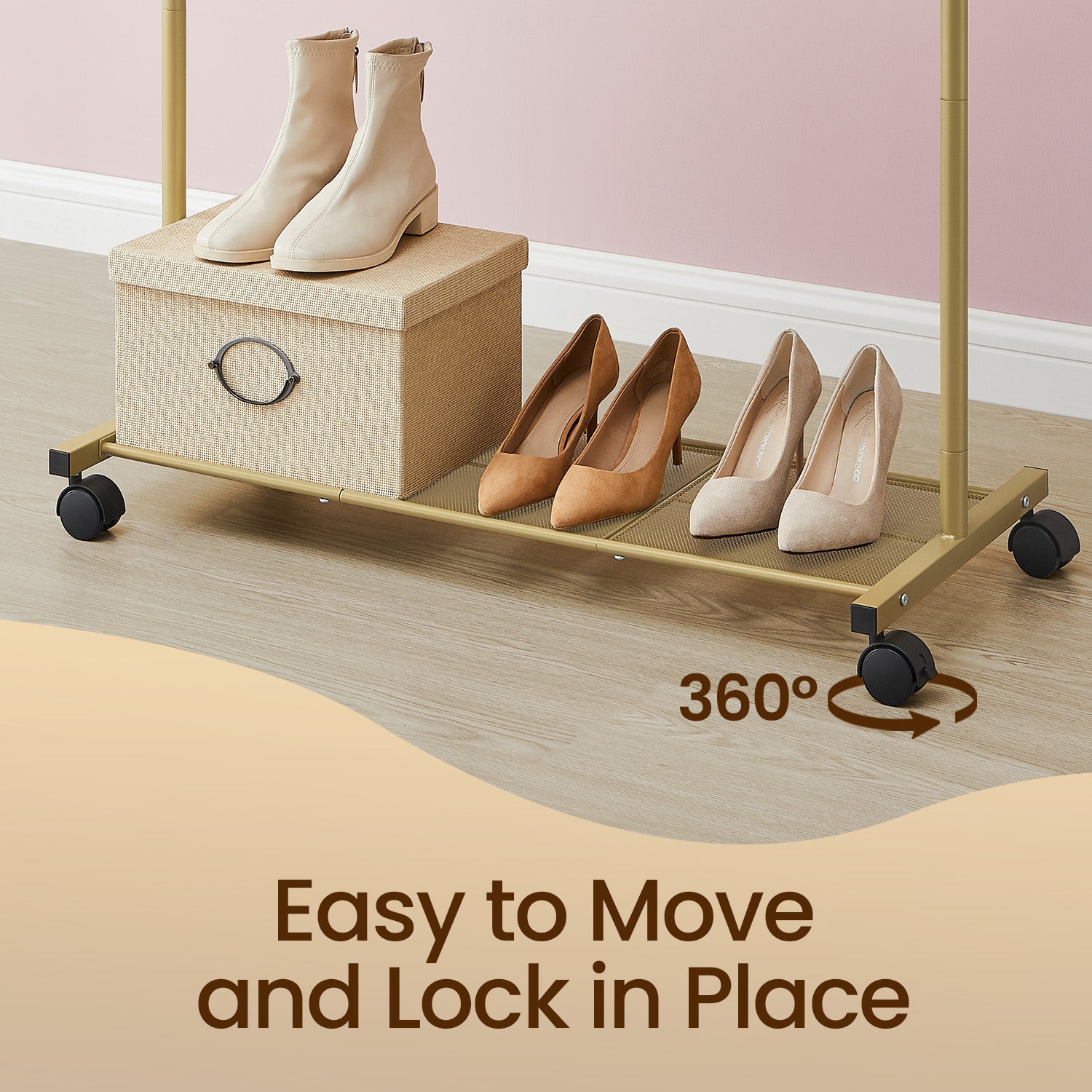 Heavy-Duty Rolling Garment Rack with Dense Mesh Shelf - 25.4mm Steel Frame, 110lb Capacity, 2 Locking Wheels, Fits 40+ Shirts, Gold