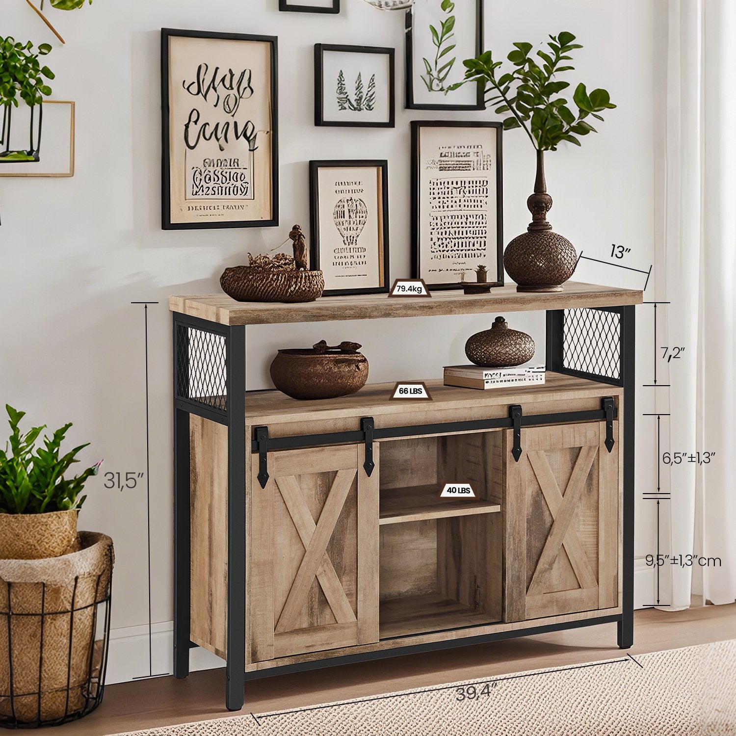 Industrial Coffee Bar Cabinet - 39.4" Sideboard with 2 Sliding Barn Doors, Adjustable Shelves, Steel Frame, Camel Brown and Black