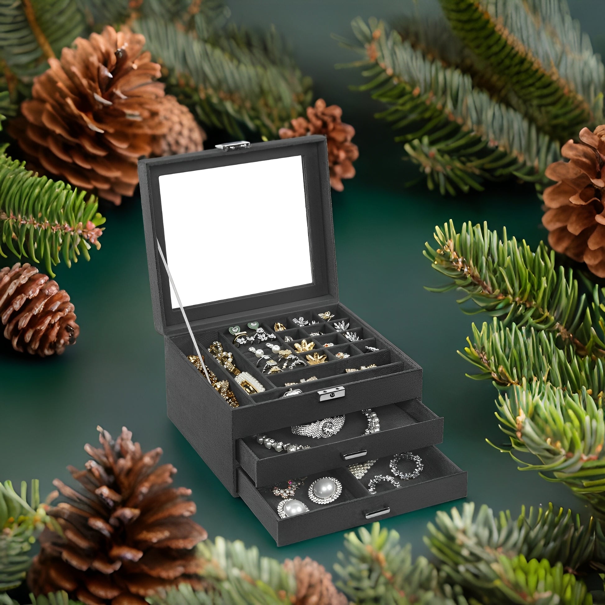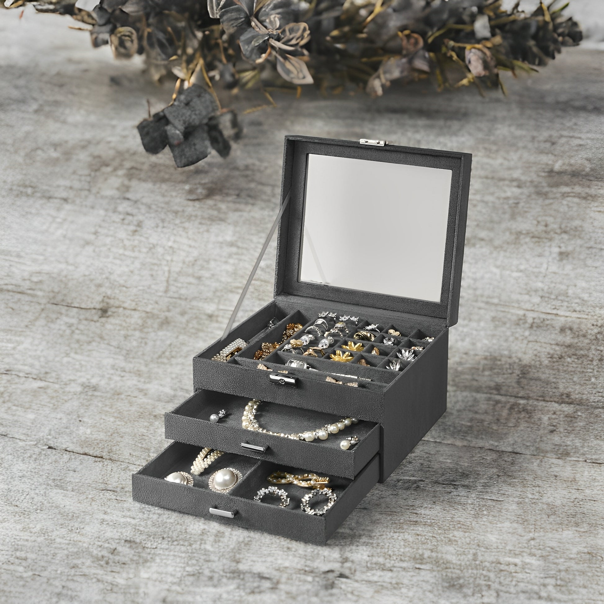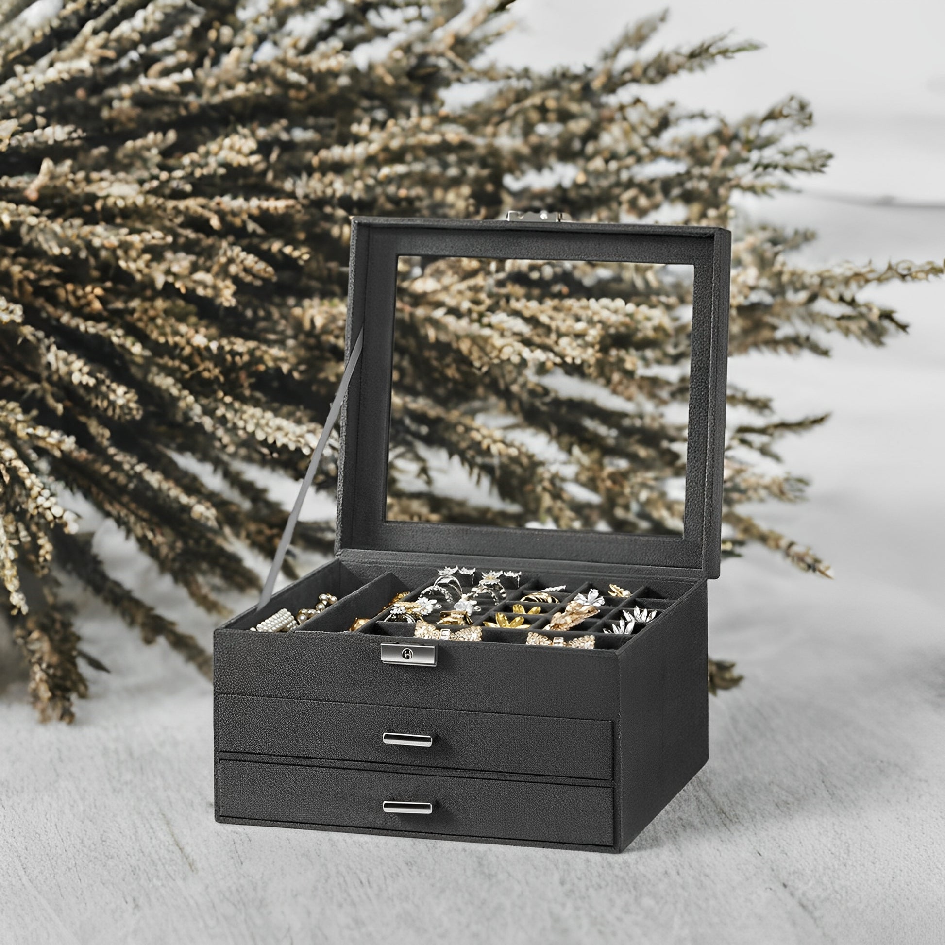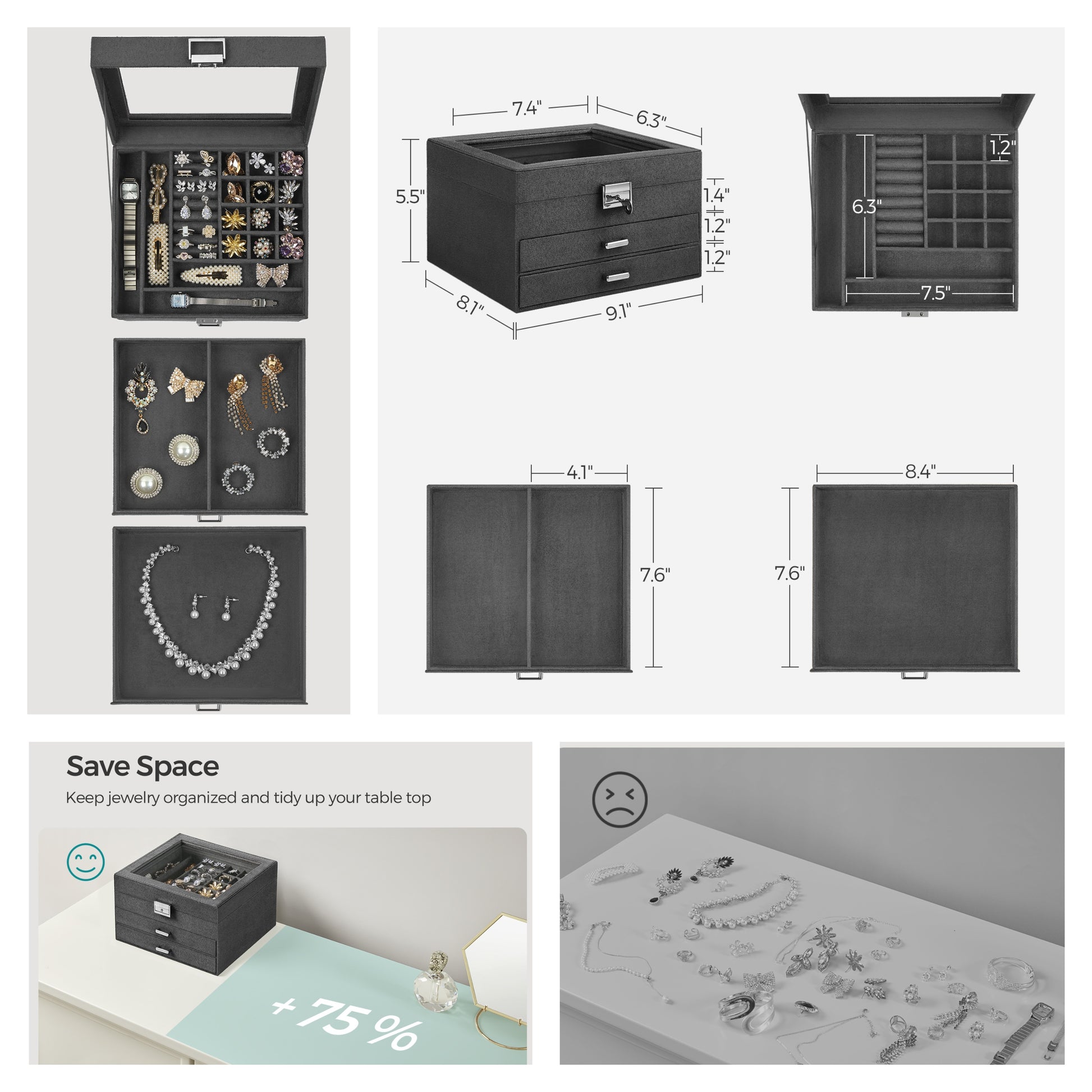 Jewelry Box with Lock, Glass Top Display Case Organizer for Rings, Earrings, Necklaces, 8 Slots & 2 Drawers, Velvet Lined, Gray