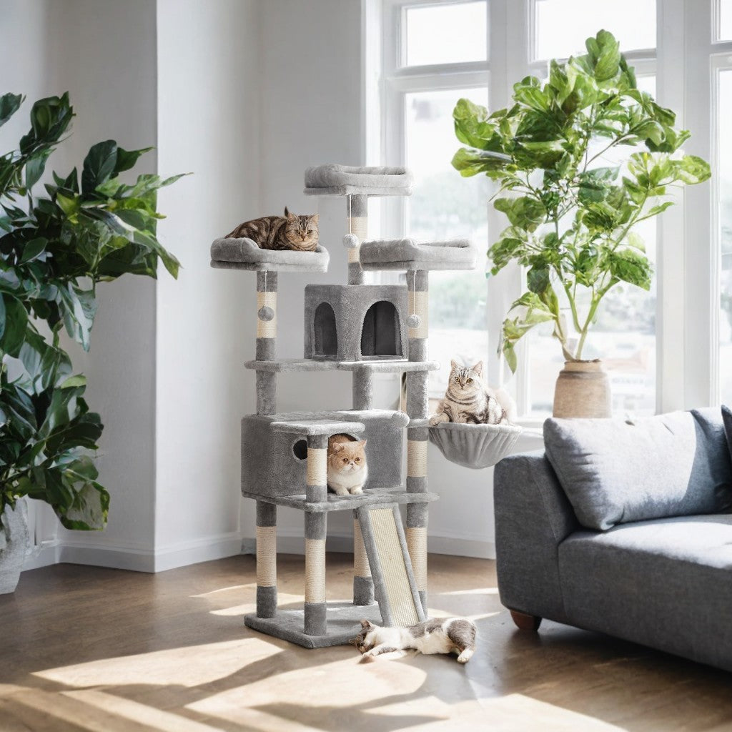 Large Cat Tree Tower - 66.5" Multi-Level Cat Condo with 2 Caves, 3 Plush Perches & Scratching Posts, Activity Center, Light Gray