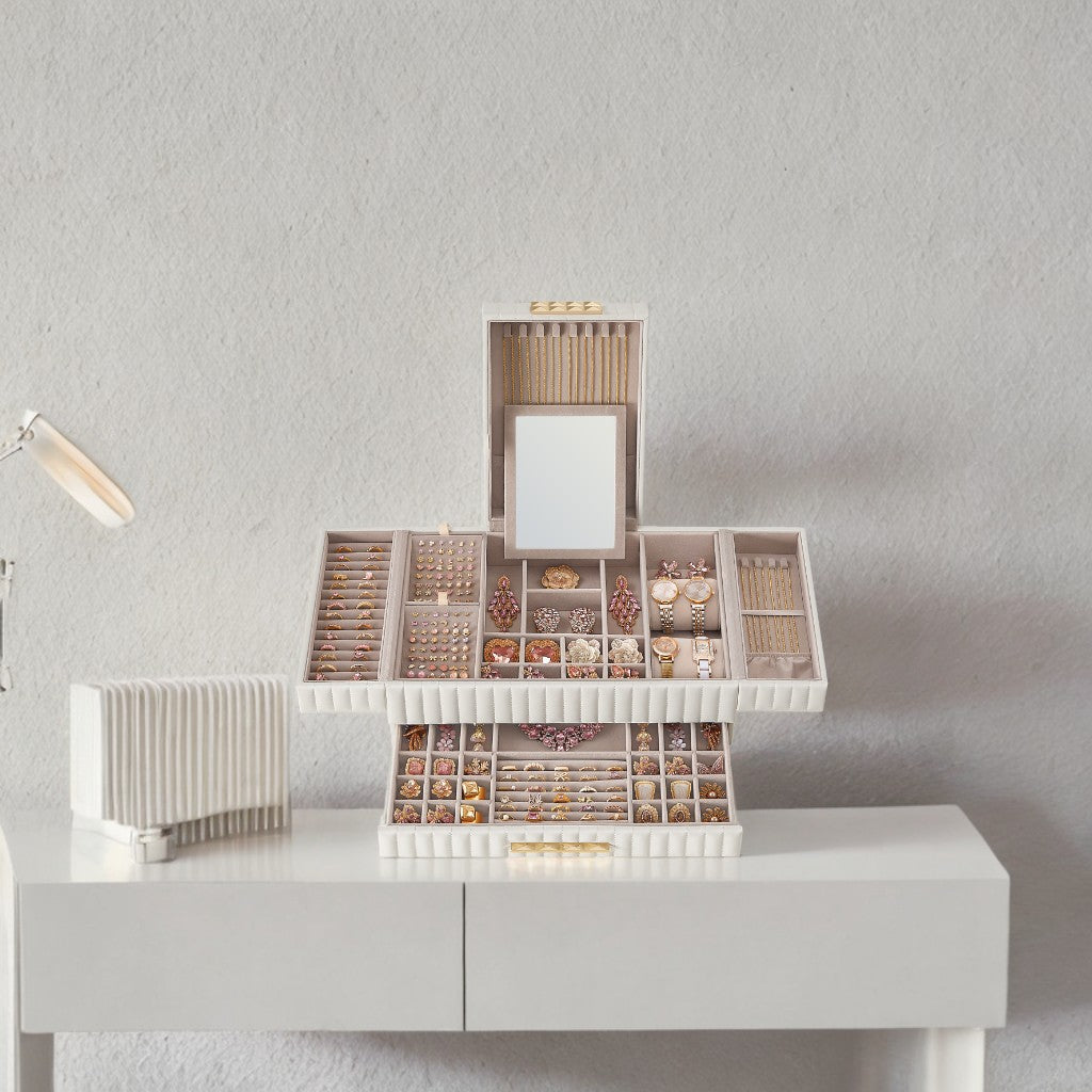 Large Jewelry Organizer with Mirror & Drawer, PU Leather Storage Box with Removable Trays, Necklace/Ring Display, Cloud White