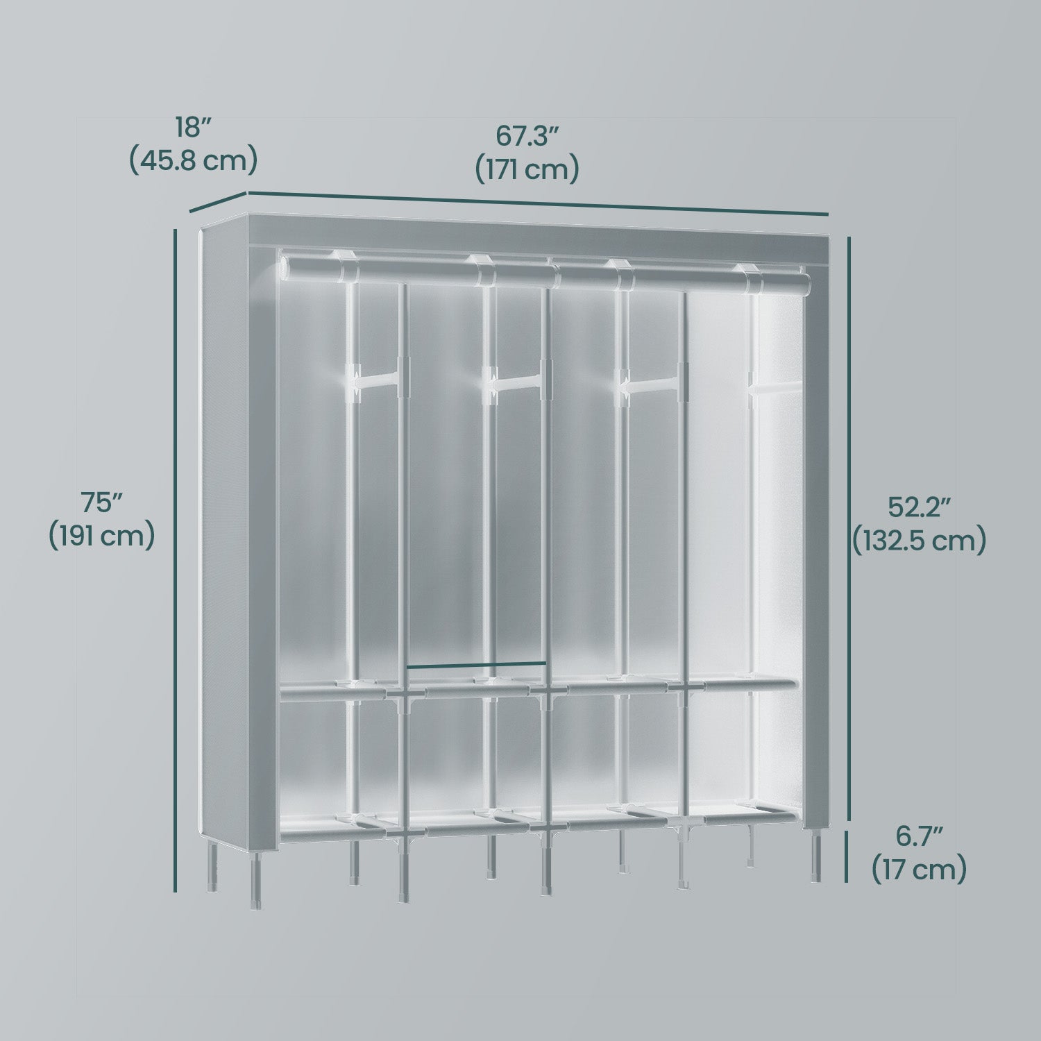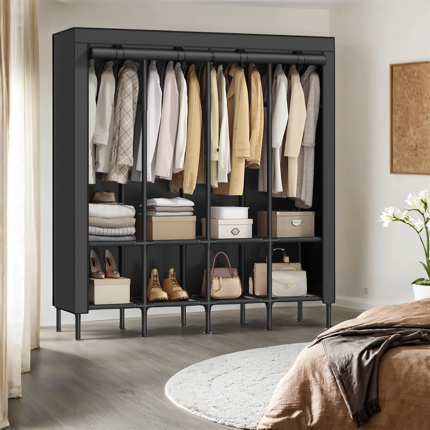Large Wardrobe Closet Organizer with 4 Rails & 8 Shelves, Freestanding Portable Clothing Rack with Fabric Cover, Ink Black