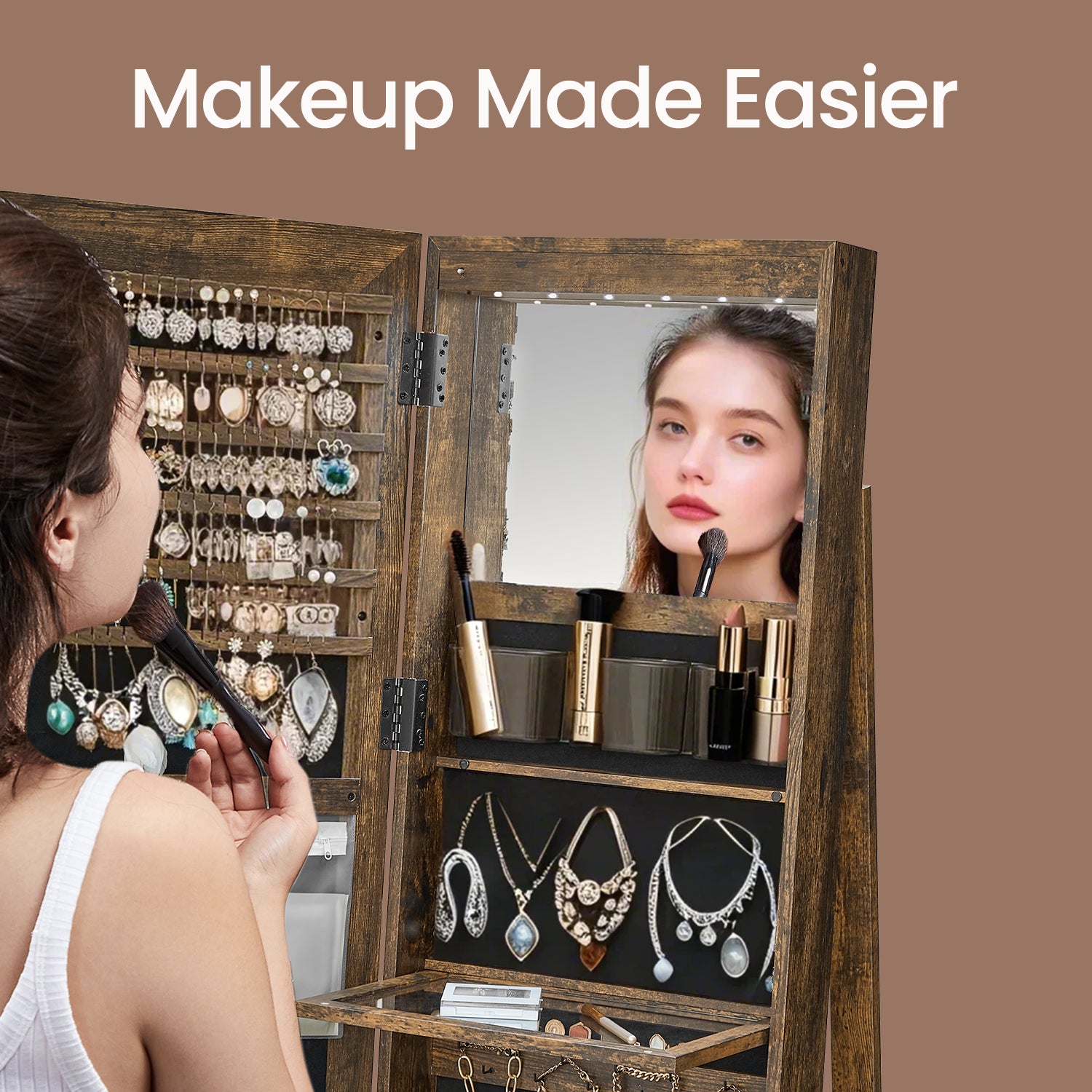 LED Illuminated Jewelry Armoire with Full-Length Mirror, Lockable Storage for 108 Earrings/78 Rings, Vanity Table, Rustic Brown