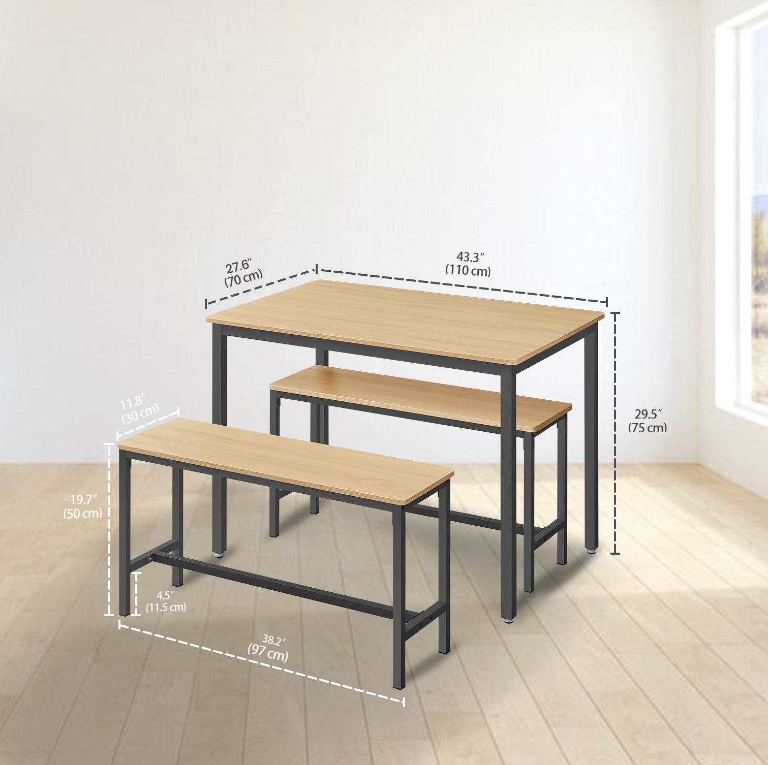 4-Person Dining Set - Space-Saving Table & 2 Benches, Easy Assembly, 43.3"L Table, 38.2"L Benches, Golden Oak and Black