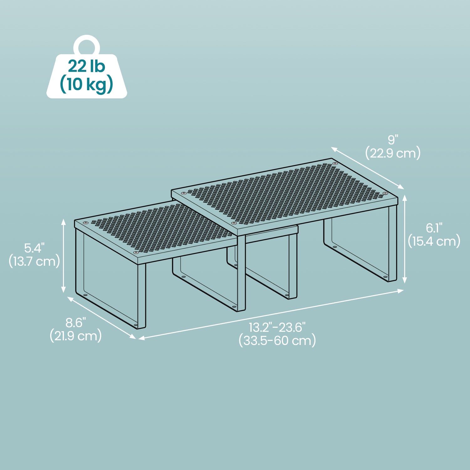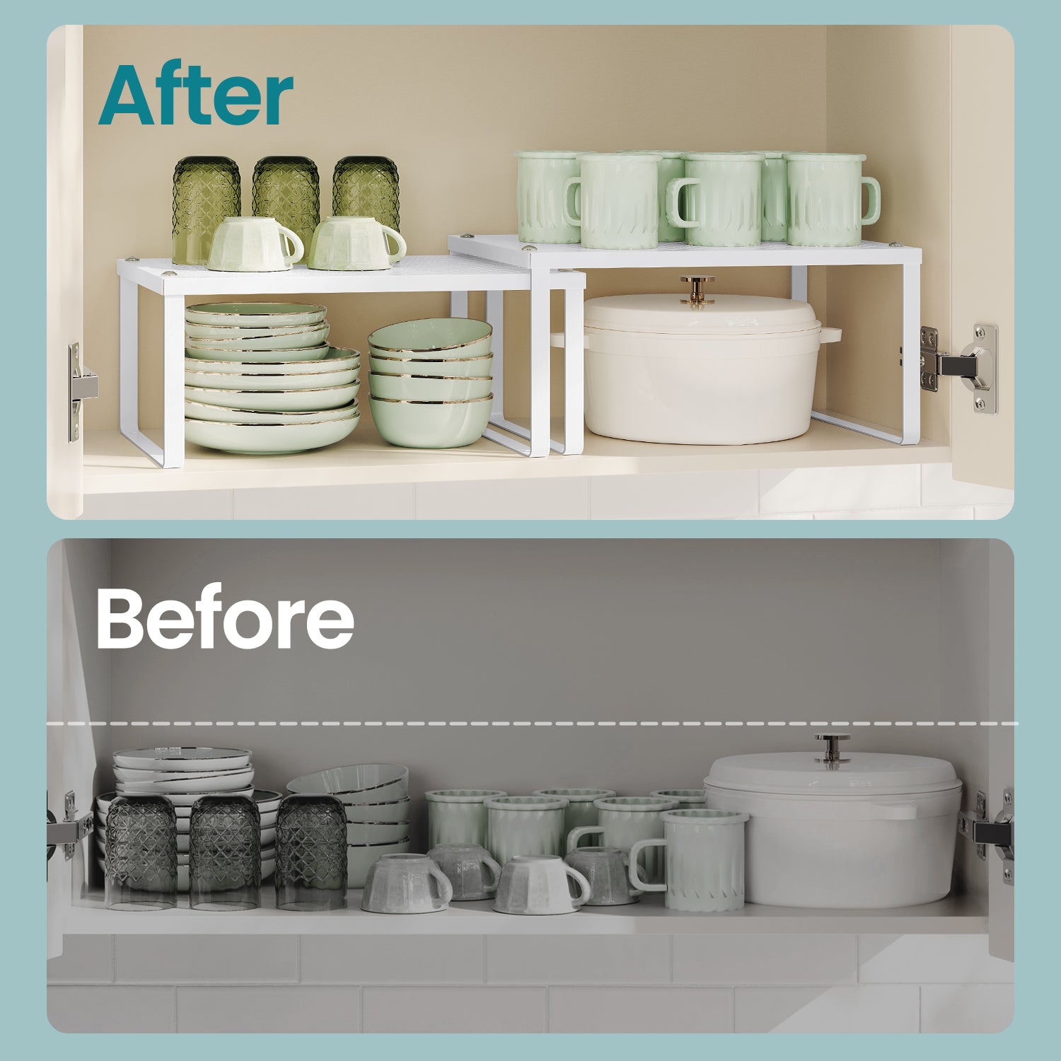 Metal Cabinet Shelf Organizers, Set of 2 Stackable & Expandable Shelf Risers, Heavy-Duty Countertop Storage for Kitchen, Cupboard, White