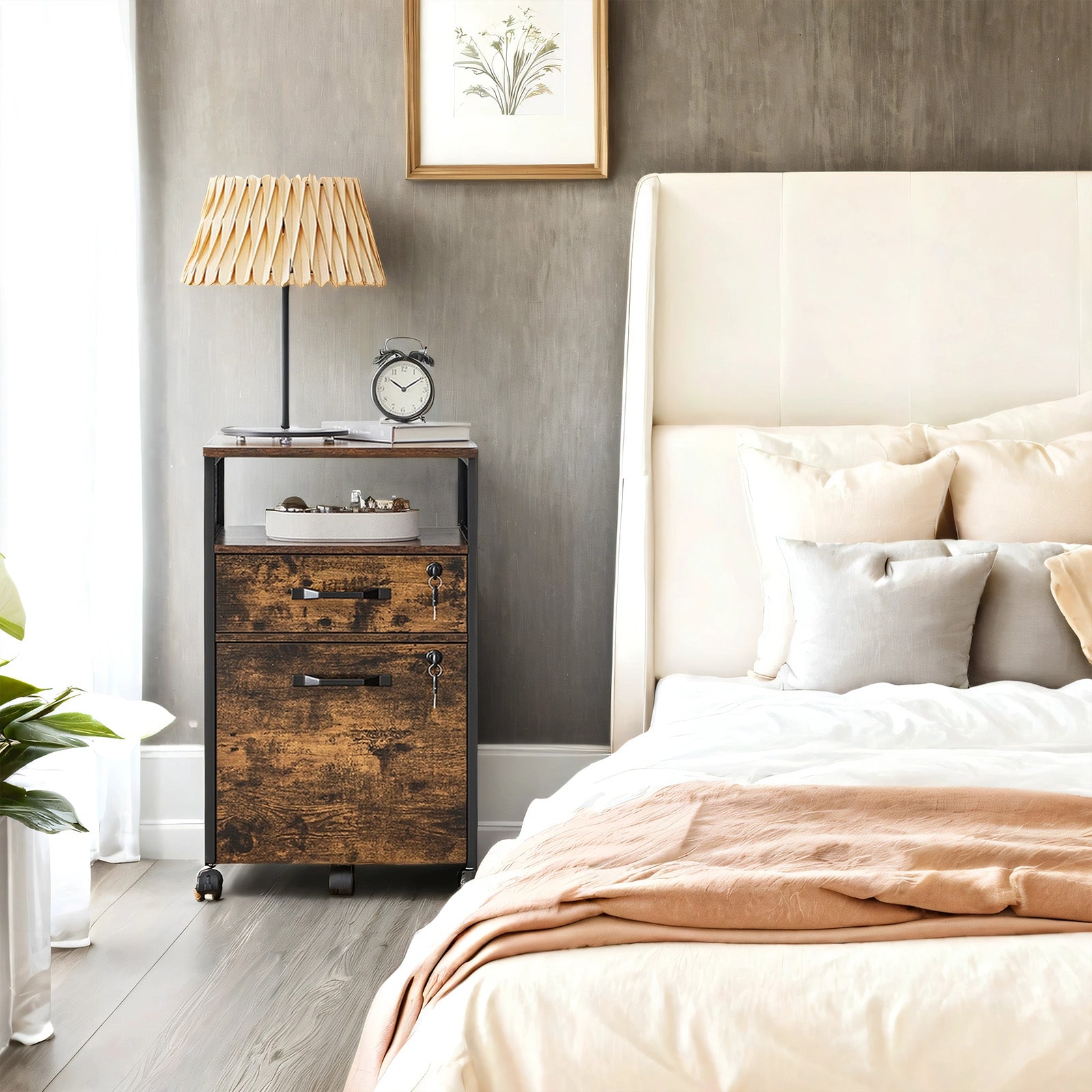 Mobile 2-Drawer File Cabinet with Lock & Wheels, Steel Frame Office Storage for A4/Letter Files, Includes Open Shelf & Locking Casters, Rustic Brown and Black