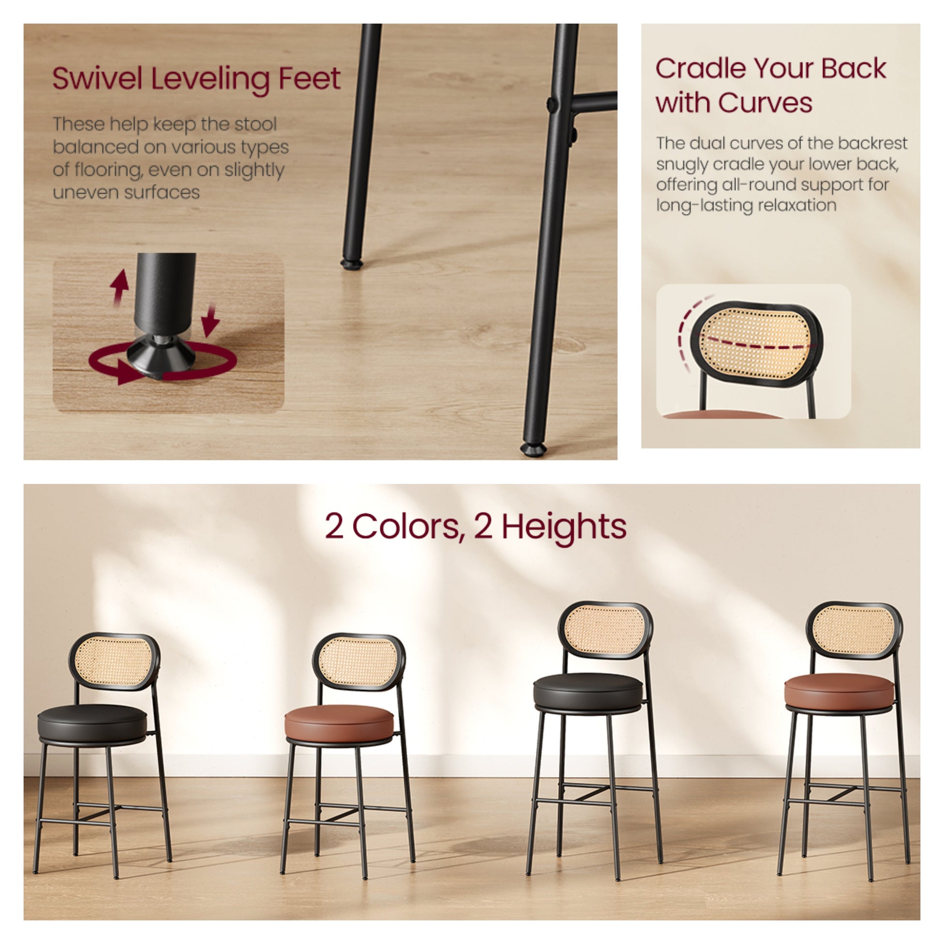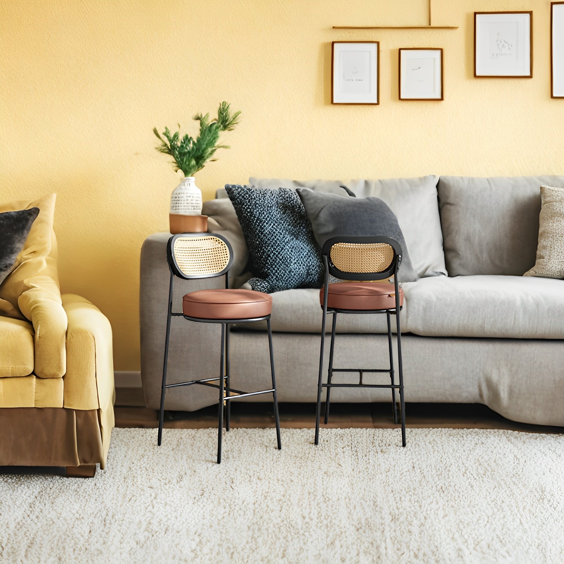 Modern Bar Stools Set of 2 with Rattan Back & Metal Base, 30.1 Inch Tall Leather Upholstered Counter Stools, Brown