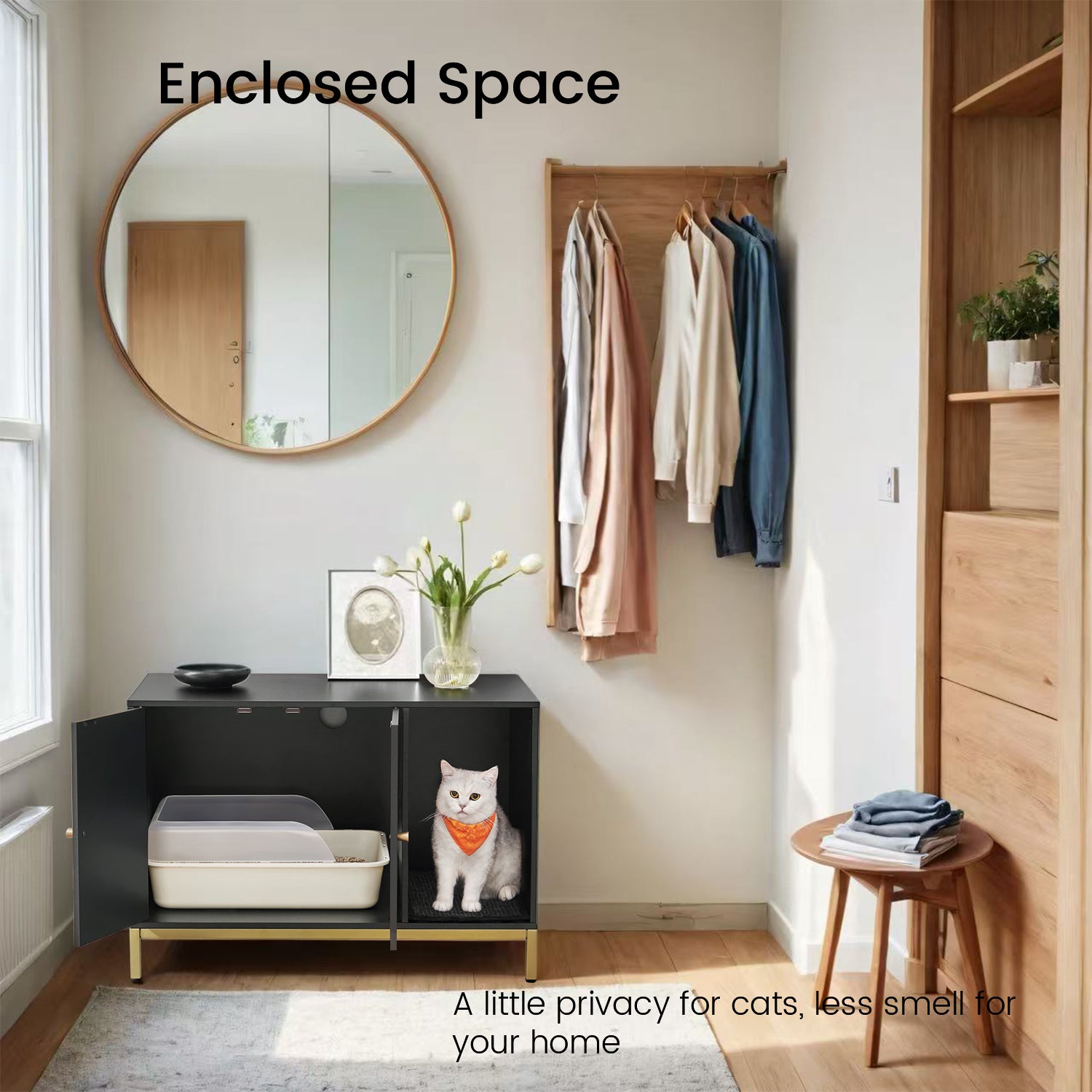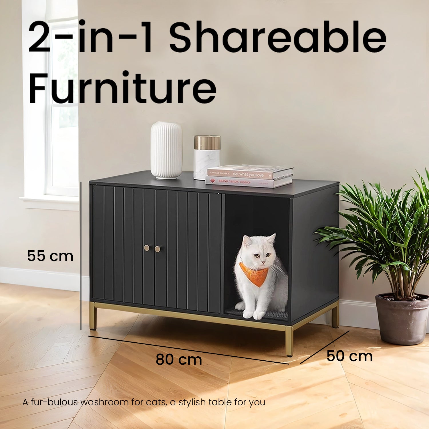 Modern Cat Litter Box Furniture - Hidden Enclosure with Scratching Mat, Dual Doors, Side Table Function, Black and Gold