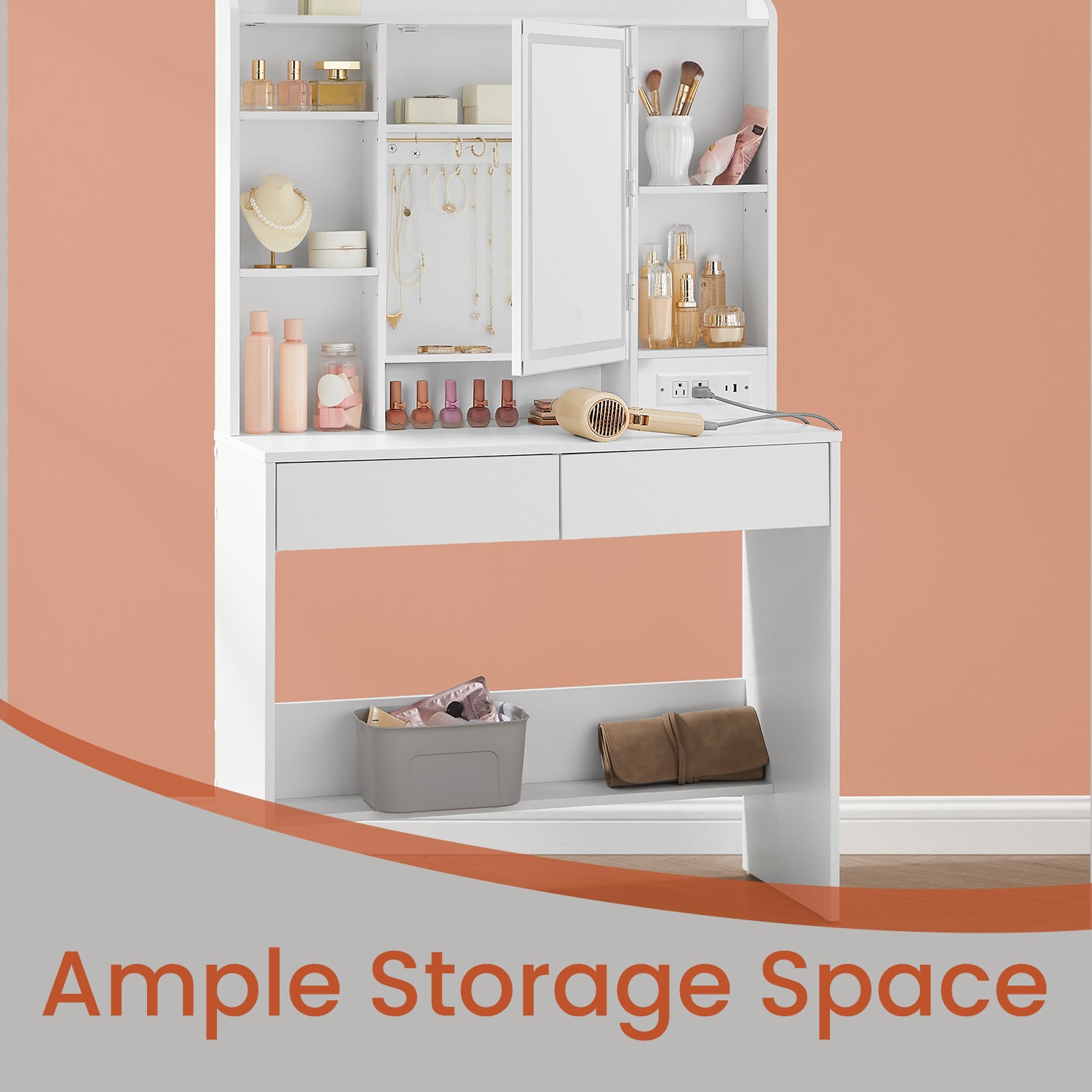Modern Makeup Vanity Set with LED Mirror & Power Outlets, Adjustable Shelves & Velvet Stool, Storage Organizer for Bedroom, Cloud White