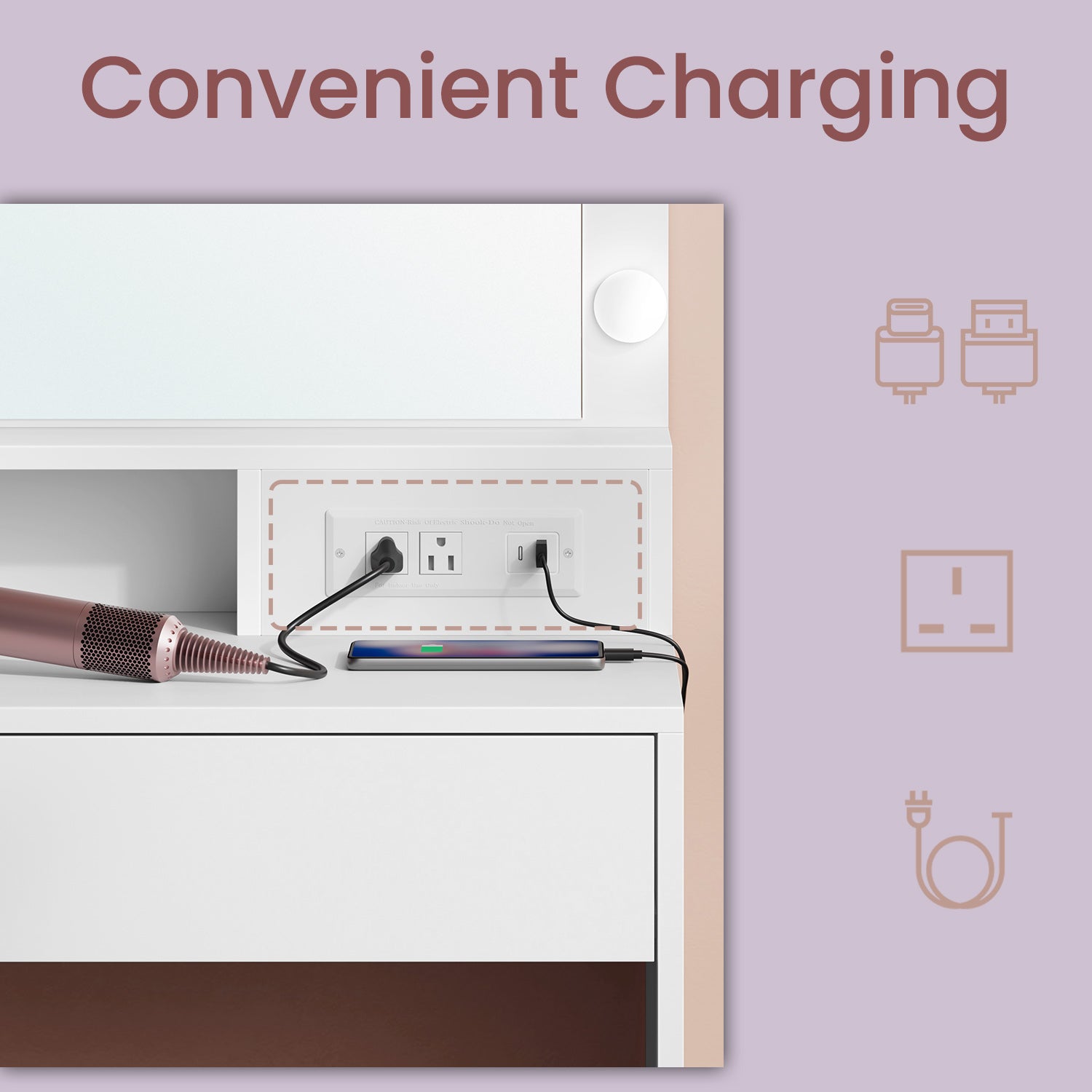 Modern Makeup Vanity Set with Power Outlets & 9 Dimmable LED Lights, Storage Drawers & Velvet Stool, for Bedroom, Cloud White