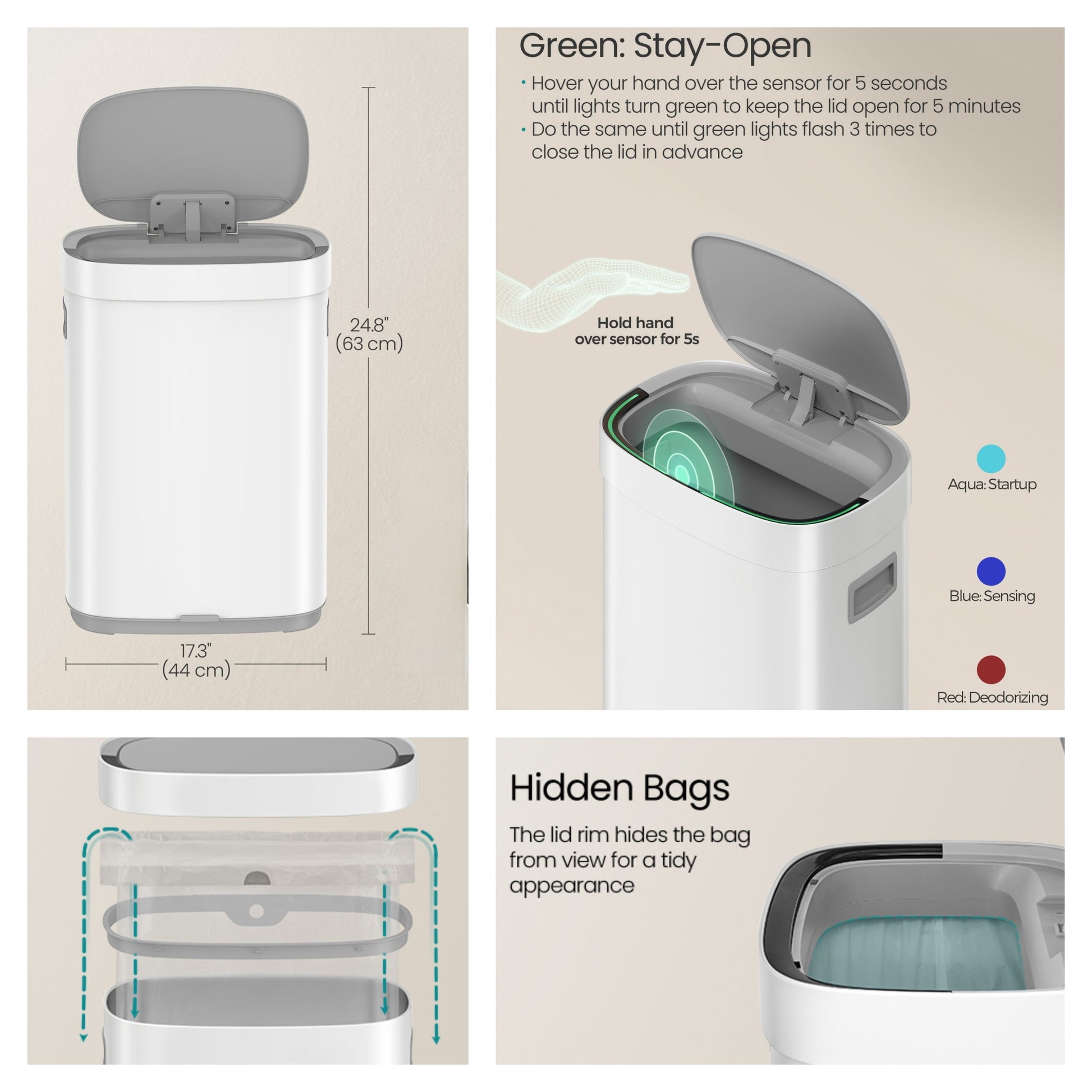 Motion Sensor Kitchen Trash Can, 17.2-Gallon Automatic Stainless Steel Garbage Bin with Ozone Odor Control and Stay-Open Lid, Cloud White