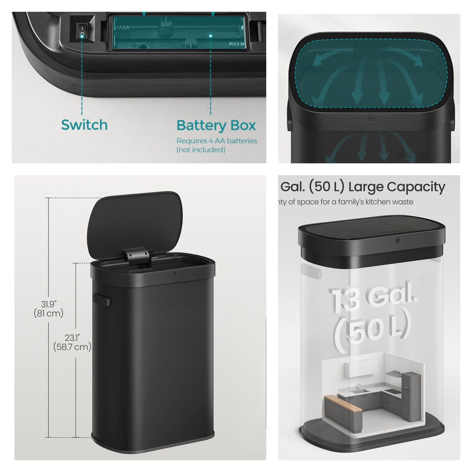 Motion Sensor Trash Can, 13 Gallon Automatic Kitchen Bin with Dual Opening & Soft Close, Includes 15 Bags – Stainless Steel,Ink Black