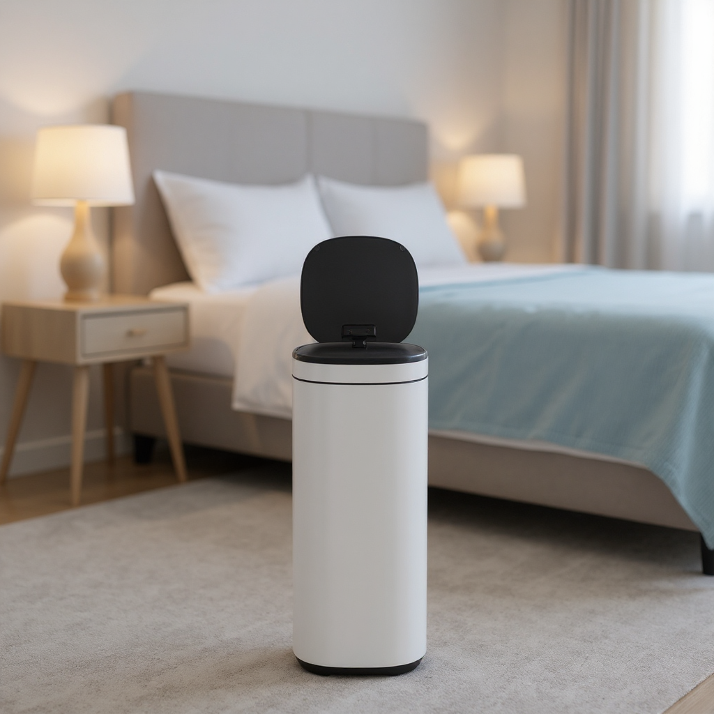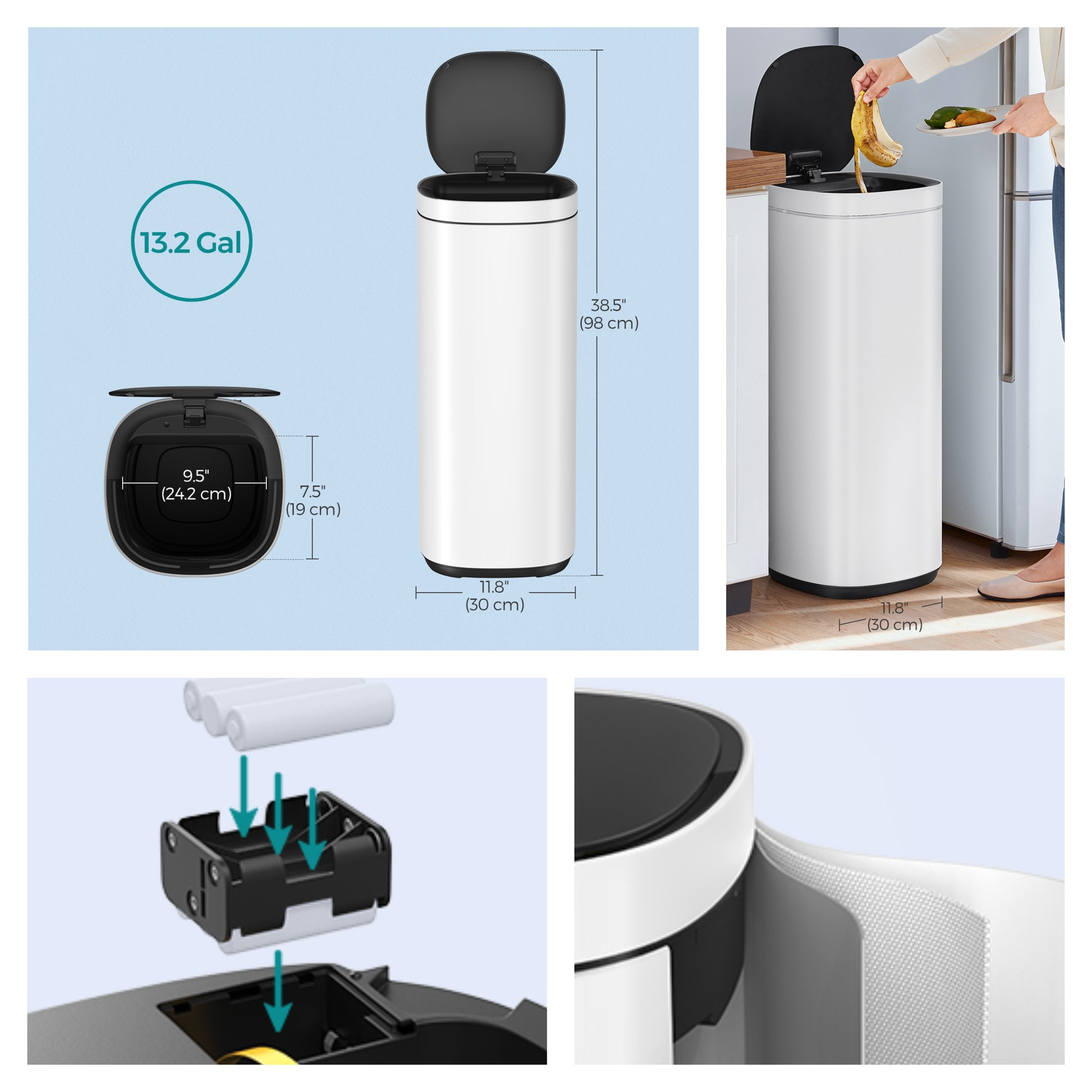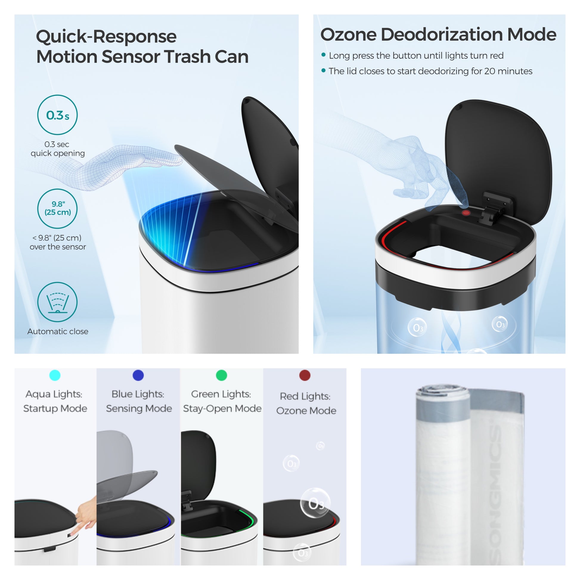 Motion Sensor Trash Can 13 Gallon, Automatic Kitchen Garbage Bin with Ozone Odor Control, Stay-Open Lid, Multi-Color Indicators, Stainless Steel,White