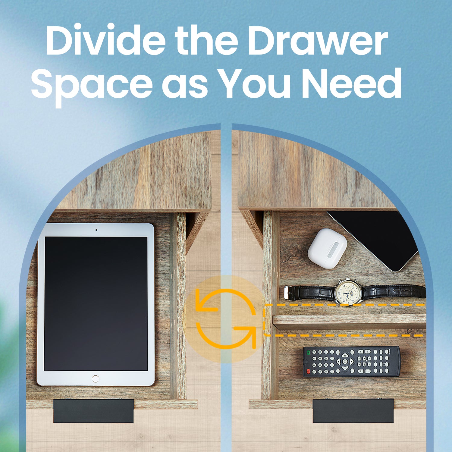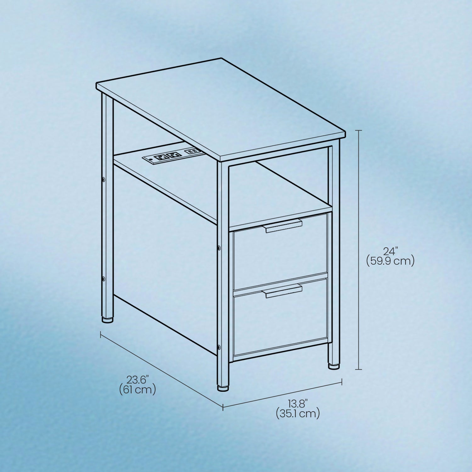 Narrow Charging Side Table - Slim End Table with 2 Drawers & Power Strip, Oak with Blue Grains and Black