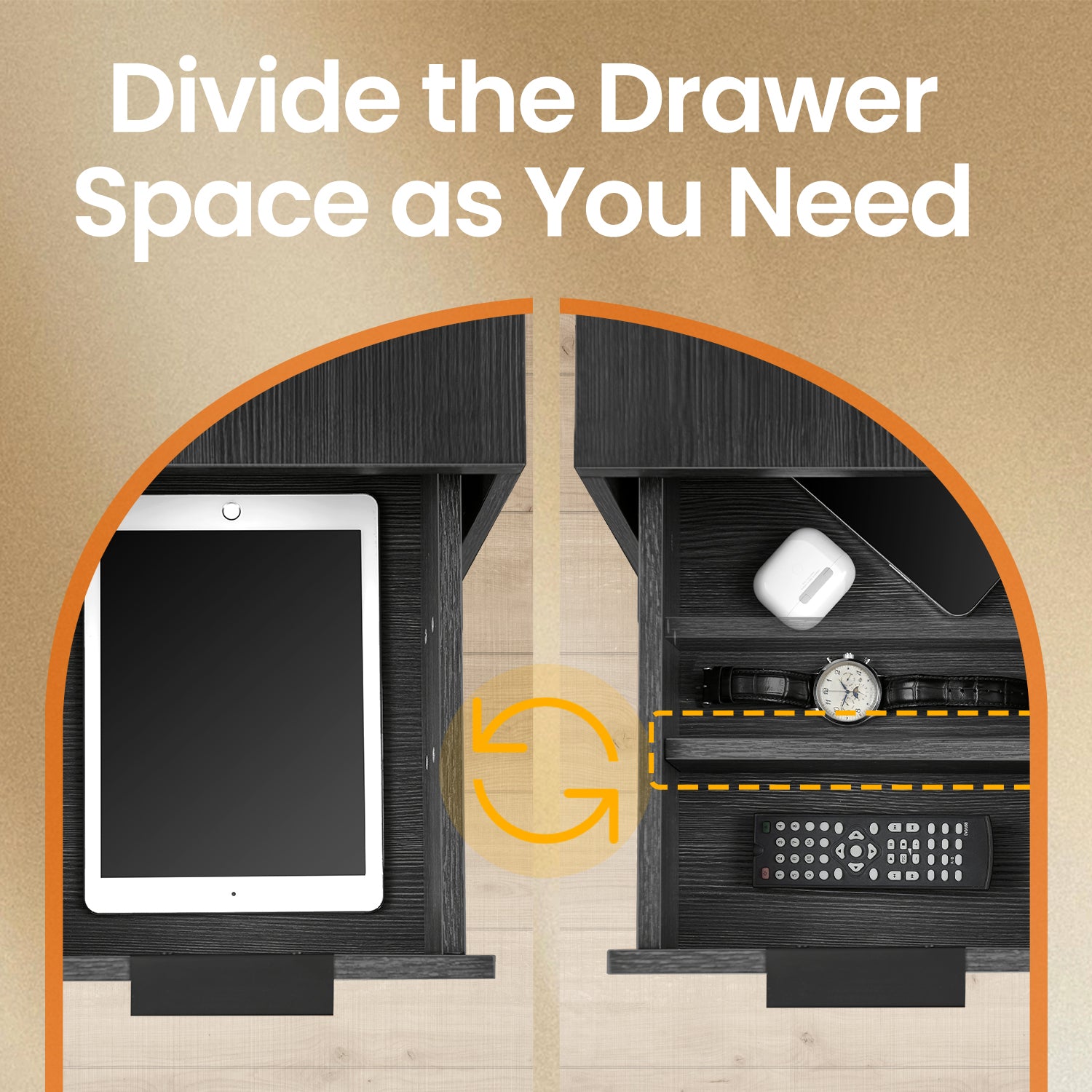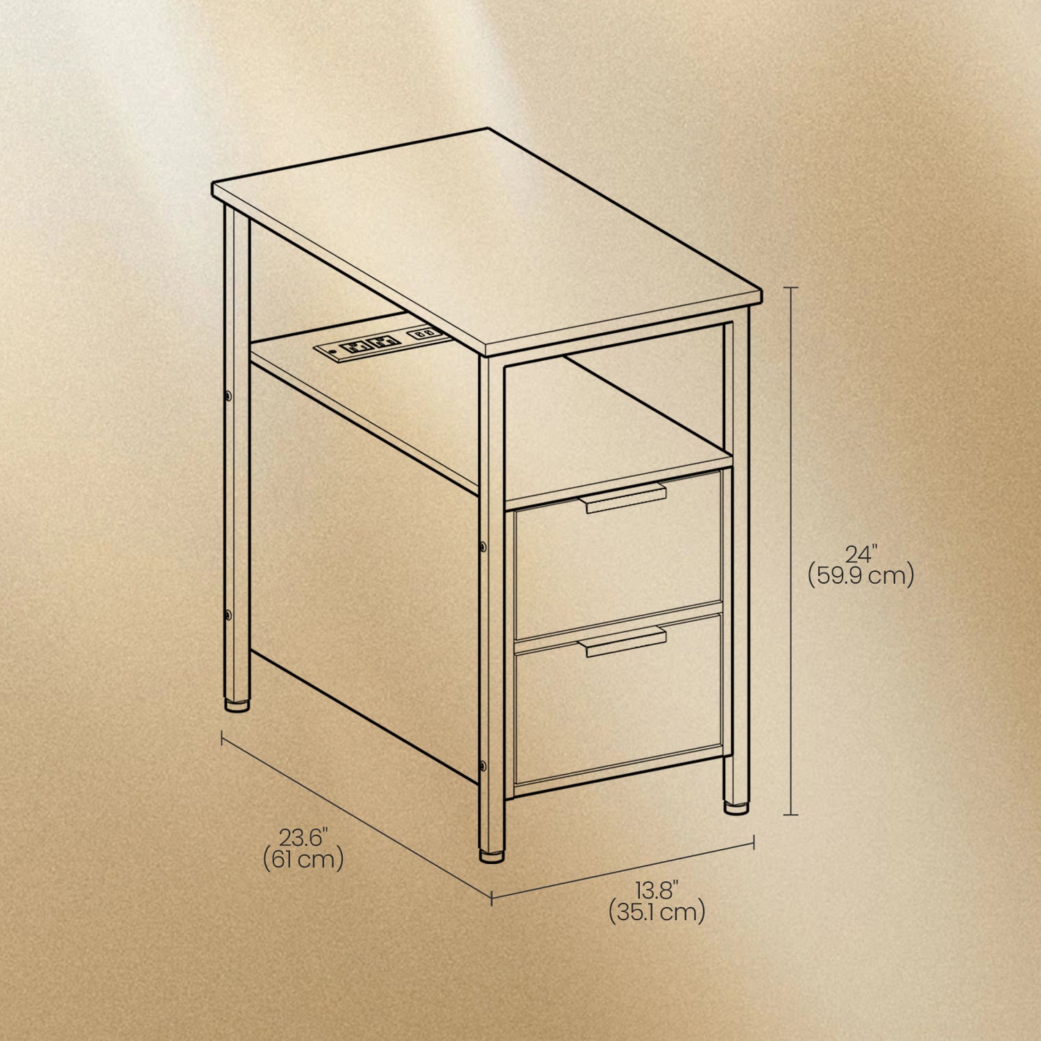 Narrow Charging Side Table - Slim End Table with 2 Drawers & Power Strip, Space-Saving Nightstand for Small Spaces, Black