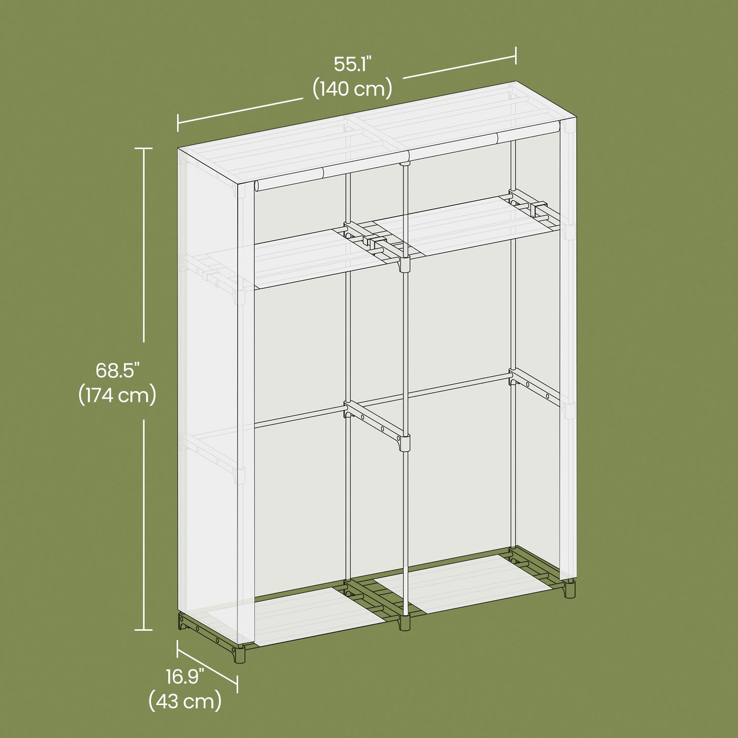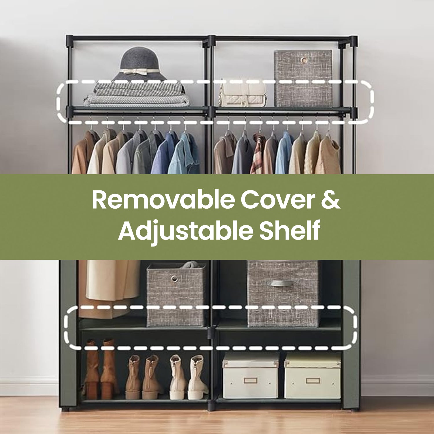Portable Closet Wardrobe with Cover, 2 Rods & 2 Shelves Freestanding Fabric Clothing Organizer for Bedroom, No-Tool Assembly, Black