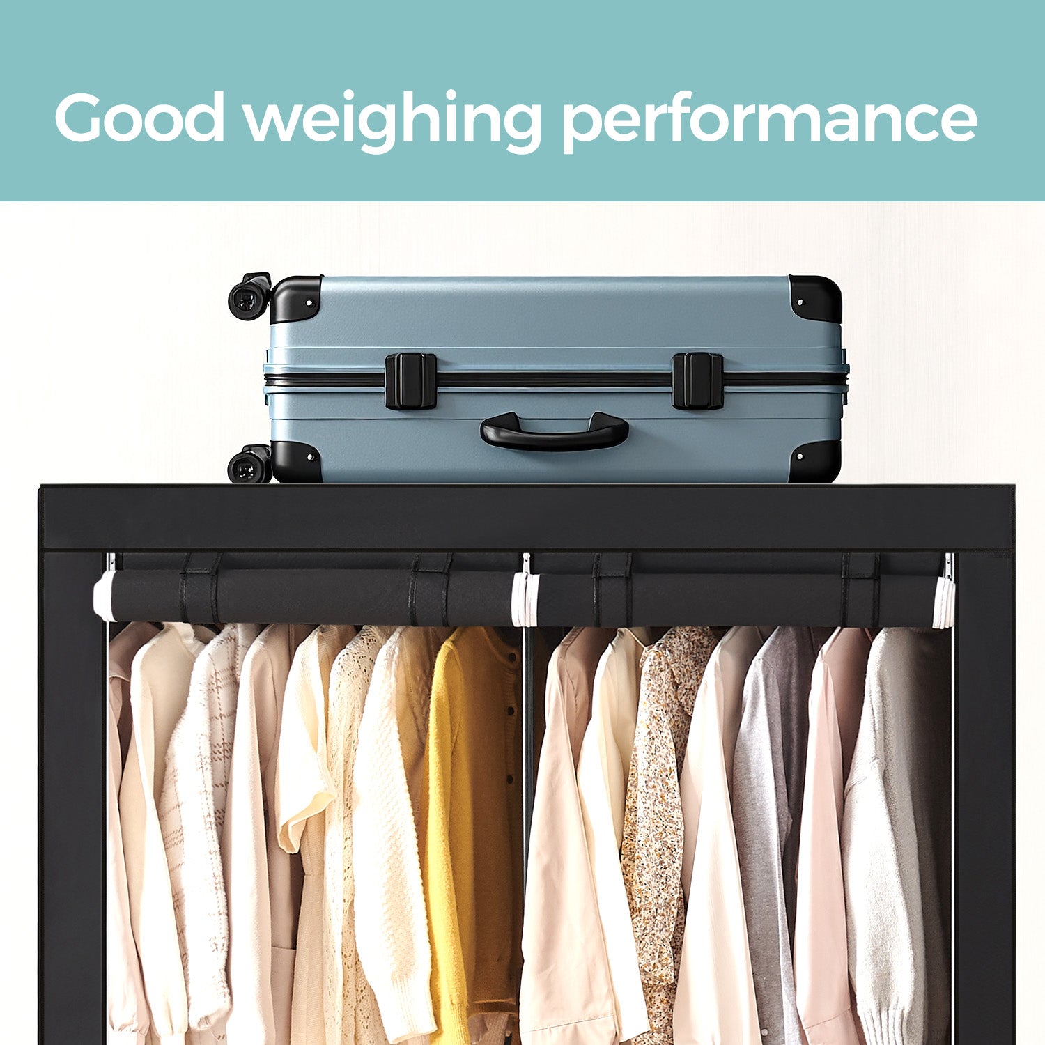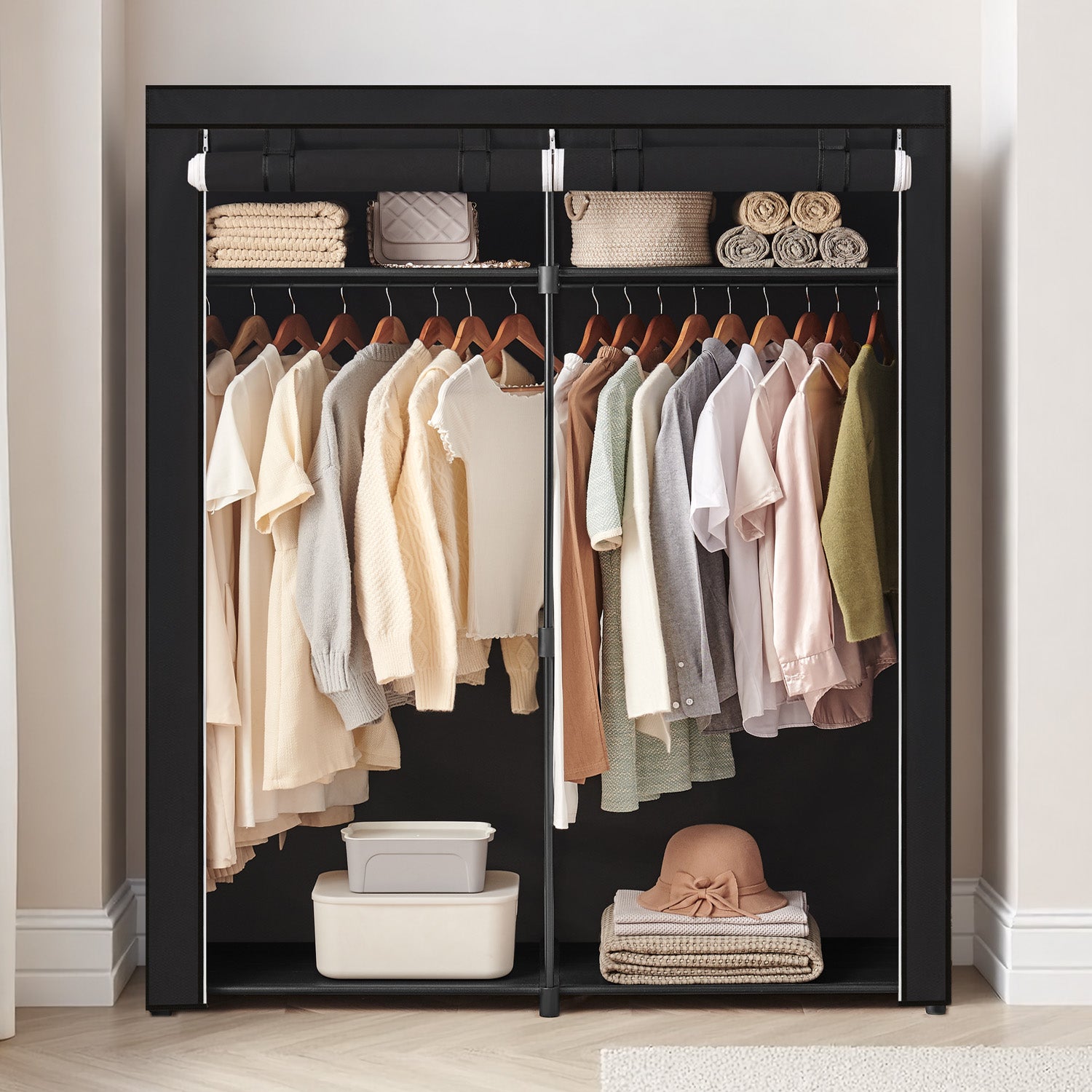 Portable Wardrobe Closet with 2 Hanging Rods & Shelves, Non-Woven Fabric Cover, Freestanding Clothing Storage Organizer for Bedroom, Tool-Free Assembly, Black