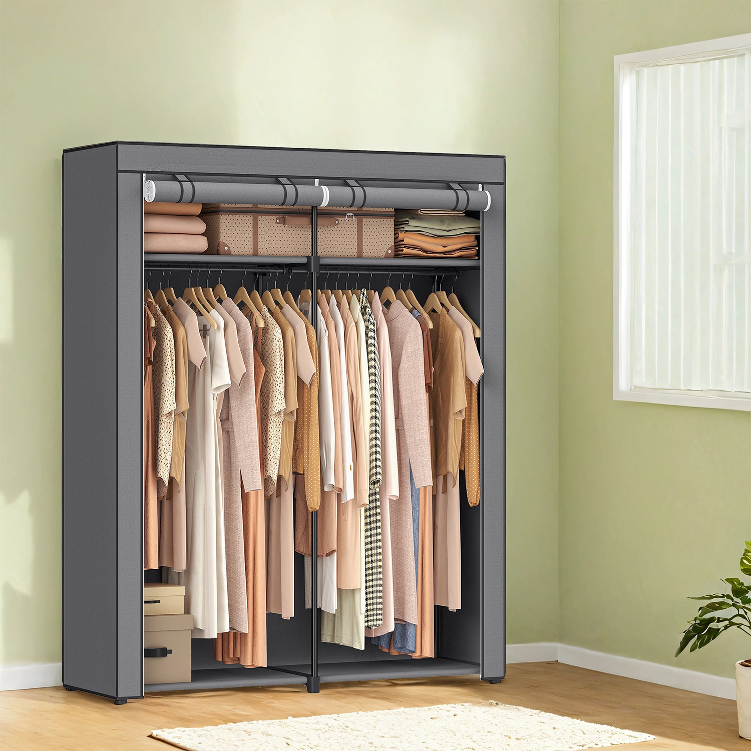 Portable Wardrobe Closet with 2 Hanging Rods & Shelves, Non-Woven Fabric Cover, Freestanding Clothing Storage Organizer for Bedroom, Tool-Free Assembly,Gray