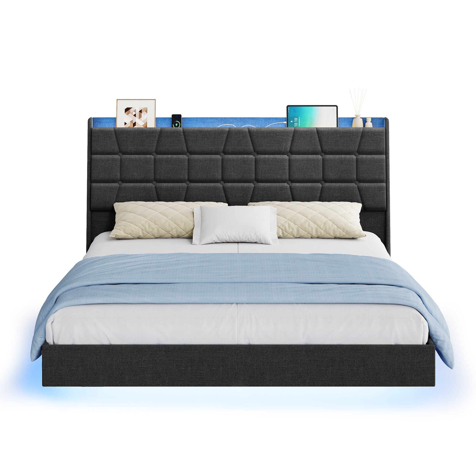 Queen Floating Bed Frame with LED Lights, Tufted Storage Headboard, Built-In Charging Station, Noise-Free Platform, Dark Gray