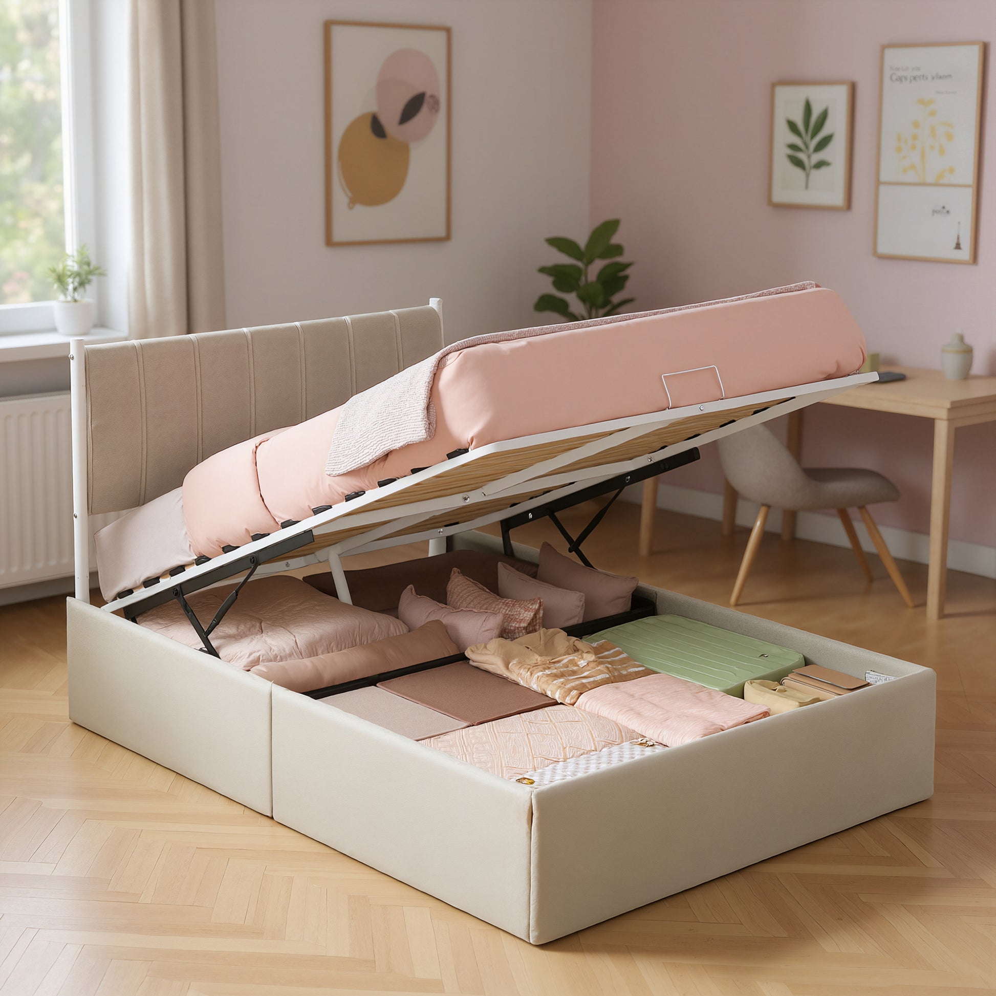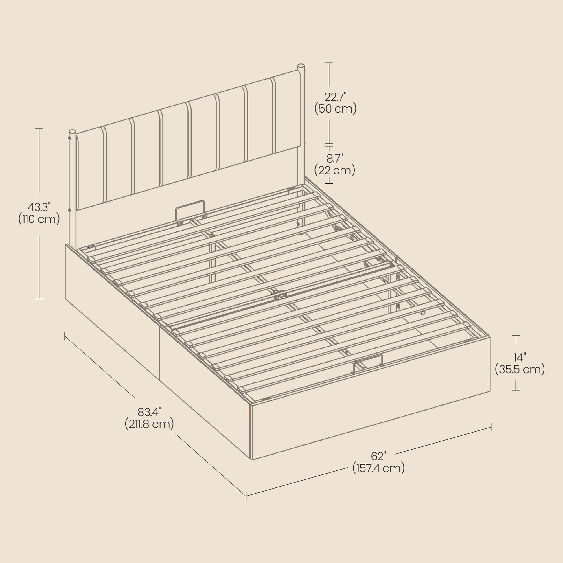 This queen-size storage bed frame offers an elegant and practical solution for maximizing bedroom space. Featuring a safe and reliable hydraulic lift system that effortlessly raises up to 154 lbs, it provides easy access to a spacious 12.5-inch high underbed storage area. The bed is built with a robust powder-coated steel frame and wooden slats, ensuring stable and quiet support with a 1100 lb capacity. An upholstered headboard with high-density foam offers comfortable support for sitting up. Designed for quick setup with snap-on slats and clear instructions, it combines modern style with functional storage.