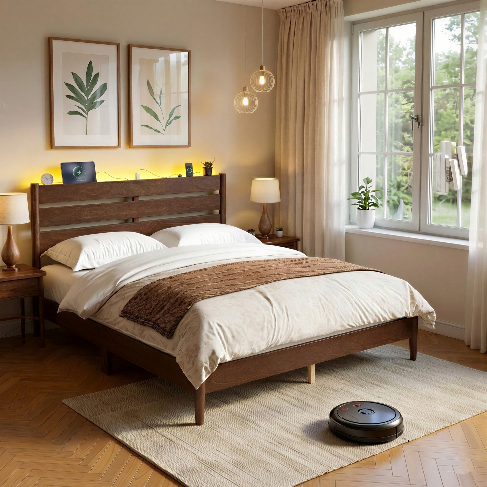 This queen-size platform bed combines mid-century modern style with functional features, featuring a sturdy frame with solid wood legs and slats for quiet, durable support. The headboard includes a convenient storage shelf and an integrated charging station with 2 AC outlets, 1 USB-A, and 1 USB-C port for easy device charging. Adjustable built-in LED lights offer multiple colors, brightness levels, and modes to customize your bedroom ambiance. Designed for stability without a box spring, it provides reliable support and fits seamlessly into various bedroom decors.