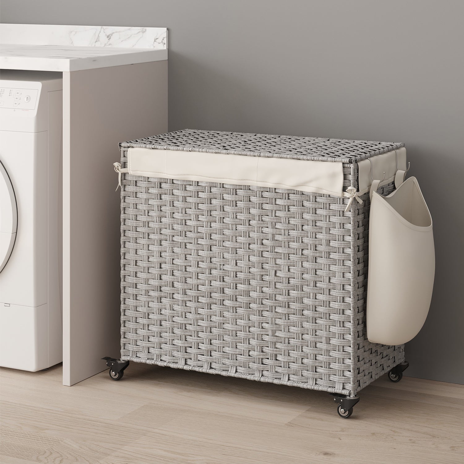 Keep your laundry routine organized and effortless with this stylish rolling hamper featuring a 42.3-gallon capacity and three pre-sorting sections for darks, lights, and colors. Crafted from ventilated, waterproof synthetic rattan and supported by a sturdy metal frame, it protects clothes while keeping them dry. The removable, washable polyester liner simplifies cleaning, and the long pull handle with four wheels—two locking—ensures smooth mobility or stationary stability. An additional 2.6-gallon side pocket provides convenient storage for small items, making this versatile hamper perfect for bedrooms, bathrooms, or laundry rooms in any home.
