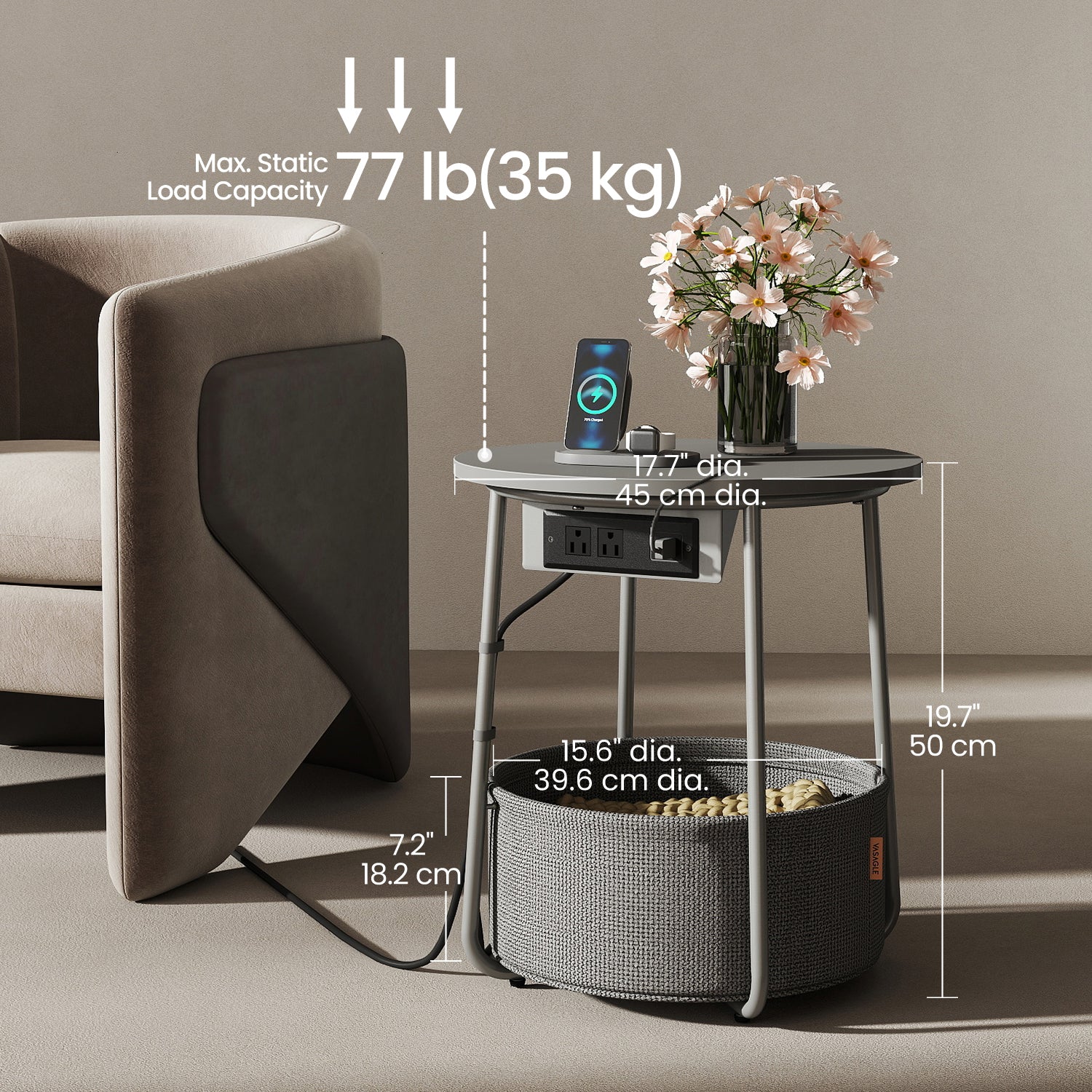 Round Charging Side Table - End Table with 2 Outlets & Fabric Basket, Space-Saving Nightstand, Dove Gray and Slate Gray