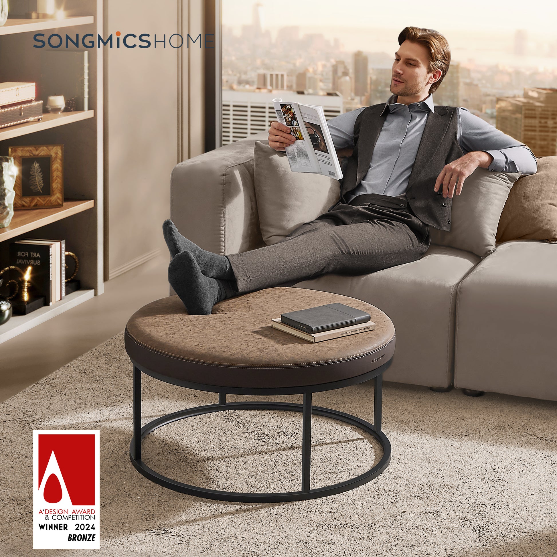 Elevate your living room with this versatile round ottoman, designed to serve as a cushy seat, footstool, coffee table, or side table thanks to its reversible top. Crafted with 25D high-resilience foam and smooth synthetic leather, it provides lasting comfort while maintaining its shape. The reinforced steel frame supports up to 660 lb and adjustable feet ensure stability on uneven floors. Minimalist clean lines paired with a two-tone walnut brown finish add modern sophistication to your space, making this multifunctional ottoman a stylish and practical centerpiece for any room.