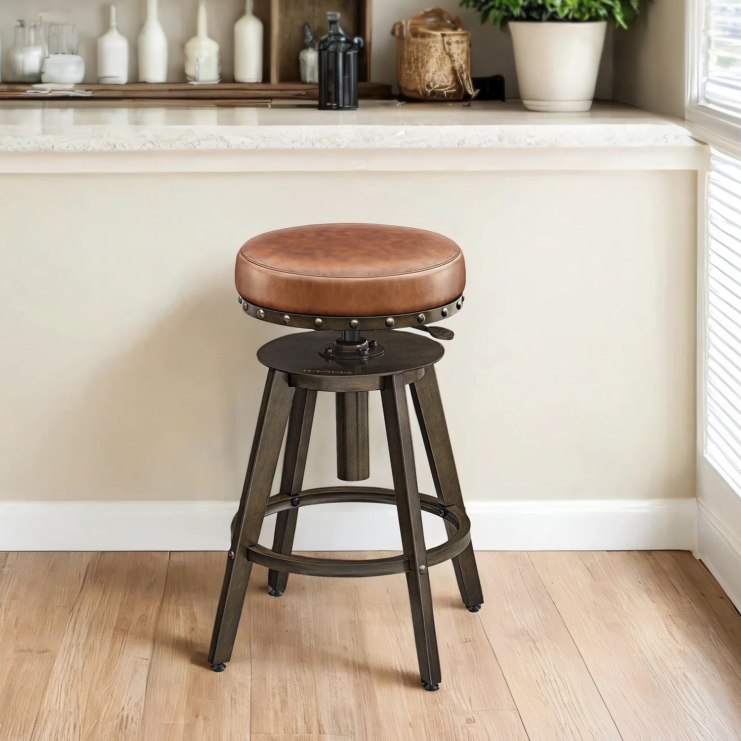 Elevate your home decor with this set of two steampunk-inspired bar stools, designed to merge distinctive industrial aesthetics with superior functionality. The stools feature generously padded seats upholstered in vintage-look synthetic leather, complemented by decorative rivets and a brushed metallic finish for an authentic, rugged charm. Enjoy effortless mobility with the 360-degree swivel function and customize the seat height from 24.6 to 29.3 inches to perfectly match your counter or bar. Built with stability in mind, the wide 19.7-inch base and adjustable leveling feet ensure firm footing on uneven surfaces while protecting your floors. Ideal for kitchen islands, home bars, or workshops, these stools offer a perfect blend of lasting comfort, robust construction, and unique style.