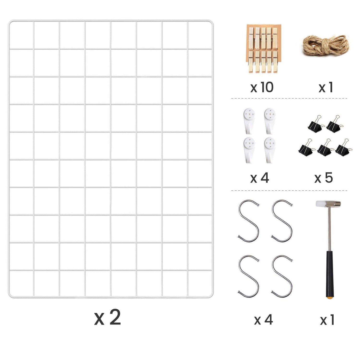 Set of 2 Metal Wall Grid Panels - 16.5"x12.2" DIY Photo Display with S Hooks, Clips & Hemp Cord - Multi-Purpose Organizer for Photos, White