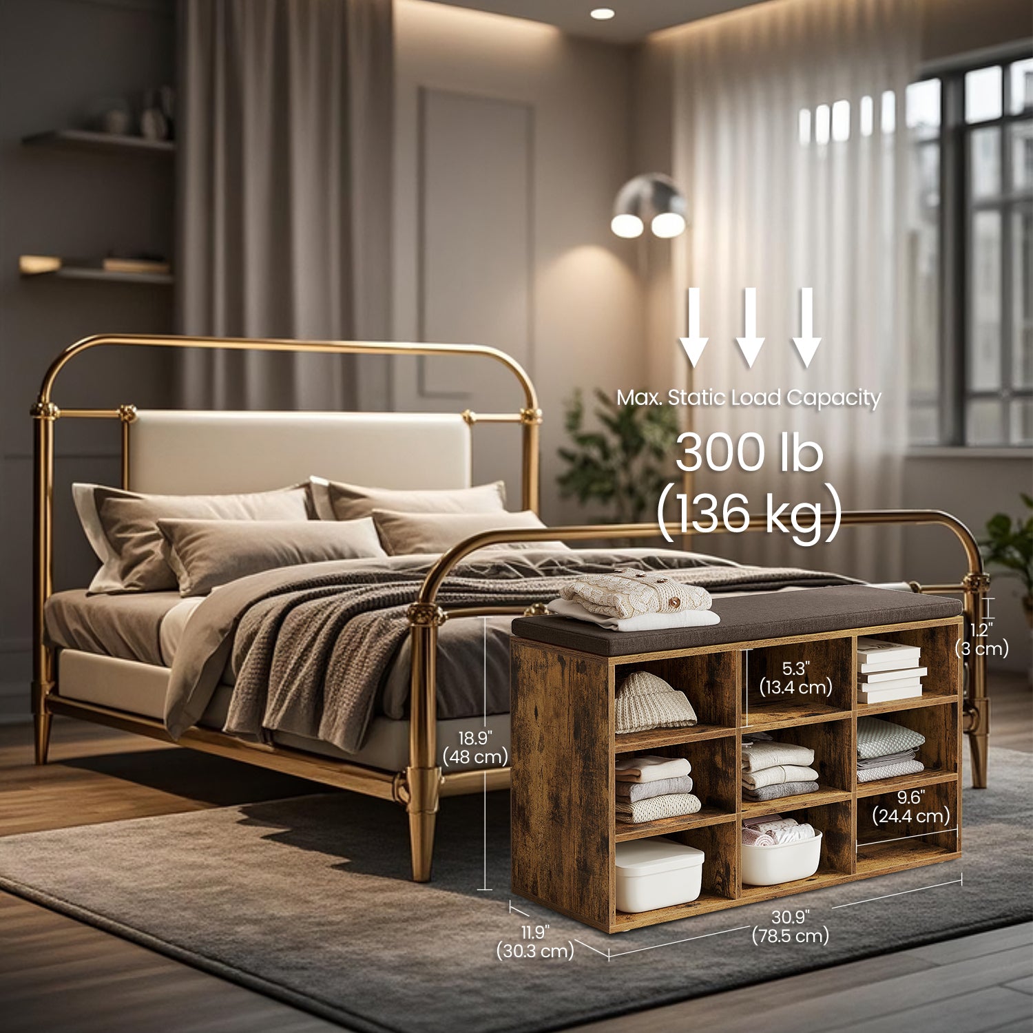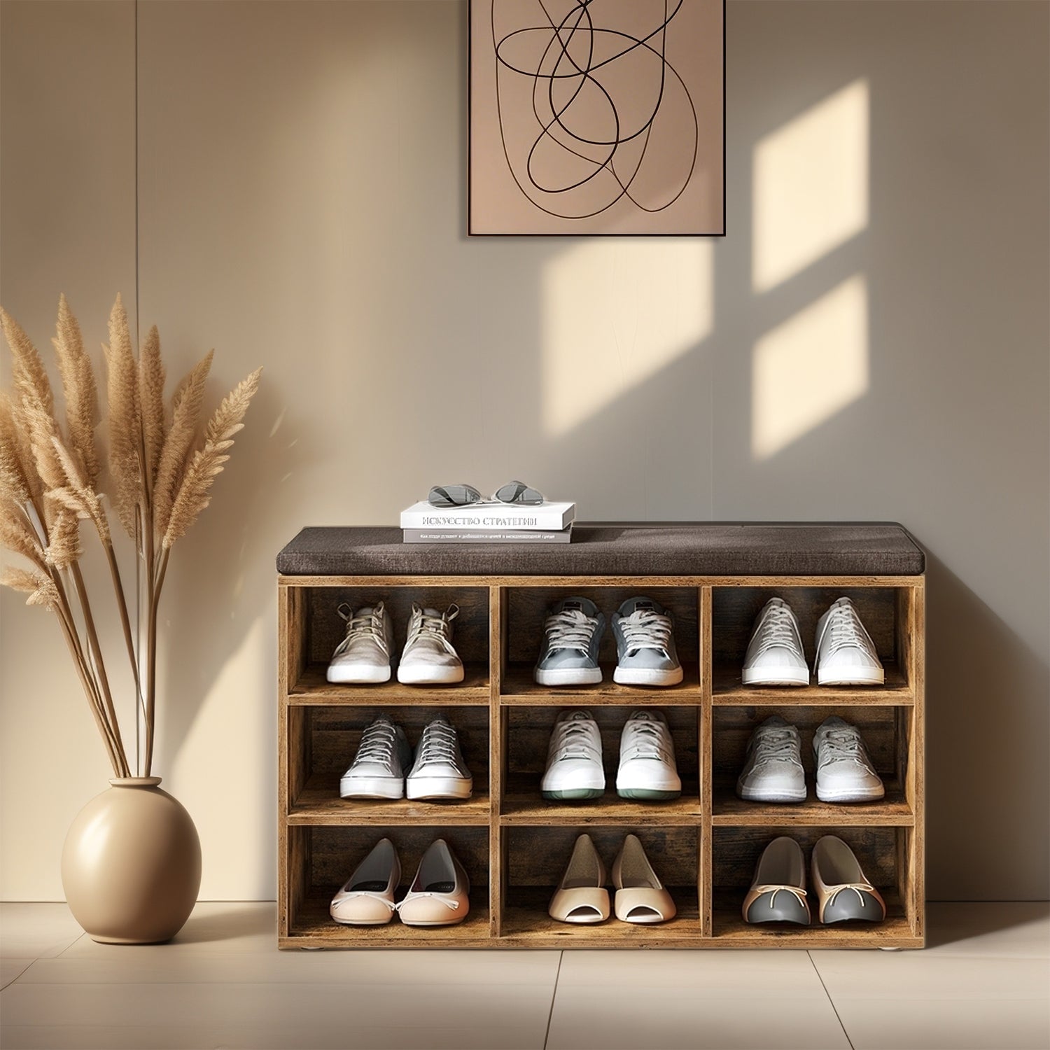 Shoe Bench, 9-Compartment Storage Bench with Removable Cushion, No-Tool Assembly Entryway Organizer,Brown