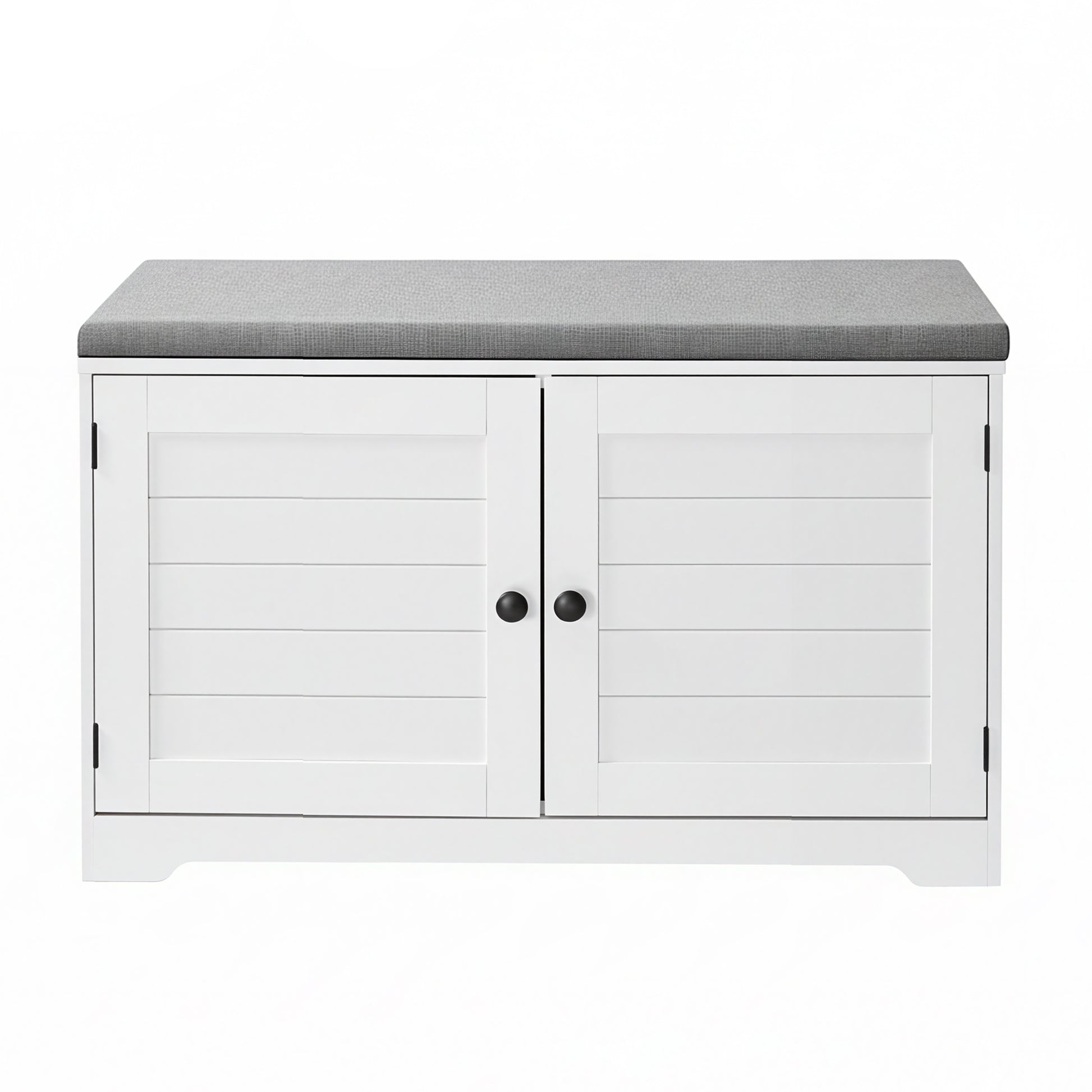 Maximize your space with this versatile 3-tier shoe storage bench, designed to keep your hallway, entryway, or bedroom organized and stylish. Featuring four adjustable shelves behind doors, it accommodates a variety of shoes, including larger sizes, while the 1.2" thick padded cushion provides a comfortable seat for putting on or taking off shoes. Crafted from durable particleboard and MDF panels, this bench supports up to 300 lb, ensuring long-lasting use. Its simple, sleek design in cloud white and dove gray effortlessly blends with modern and farmhouse interiors. Easy assembly with labeled parts allows you to enjoy a tidy and functional entryway in no time.