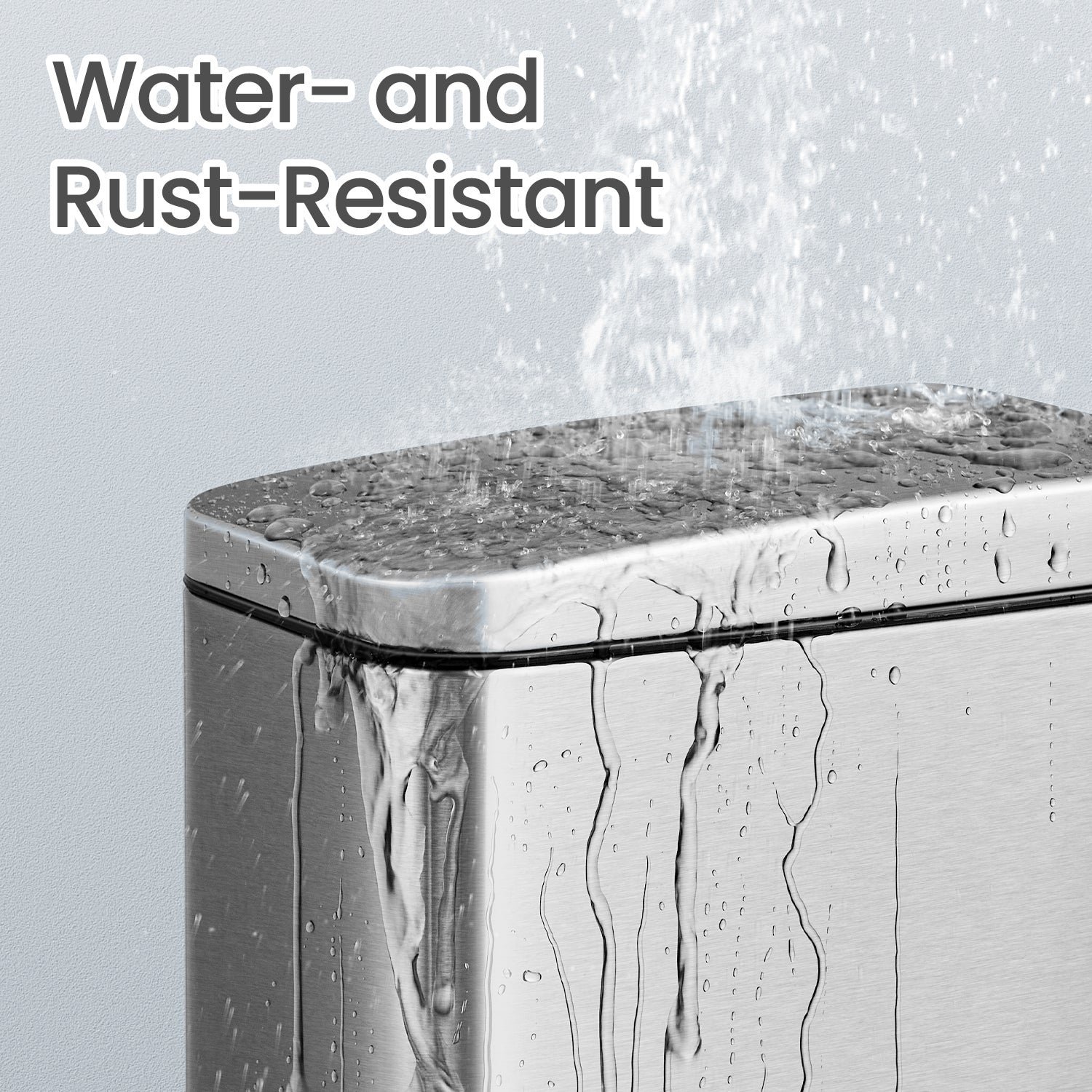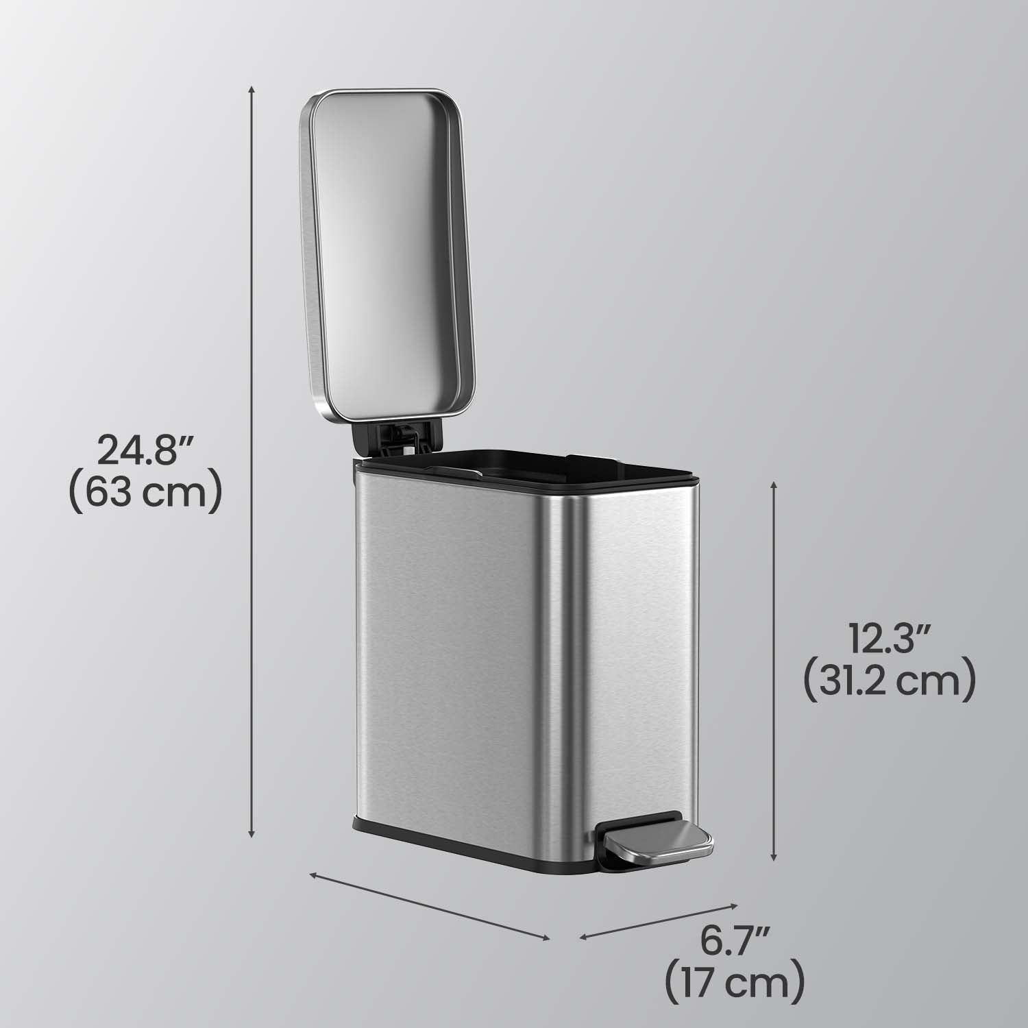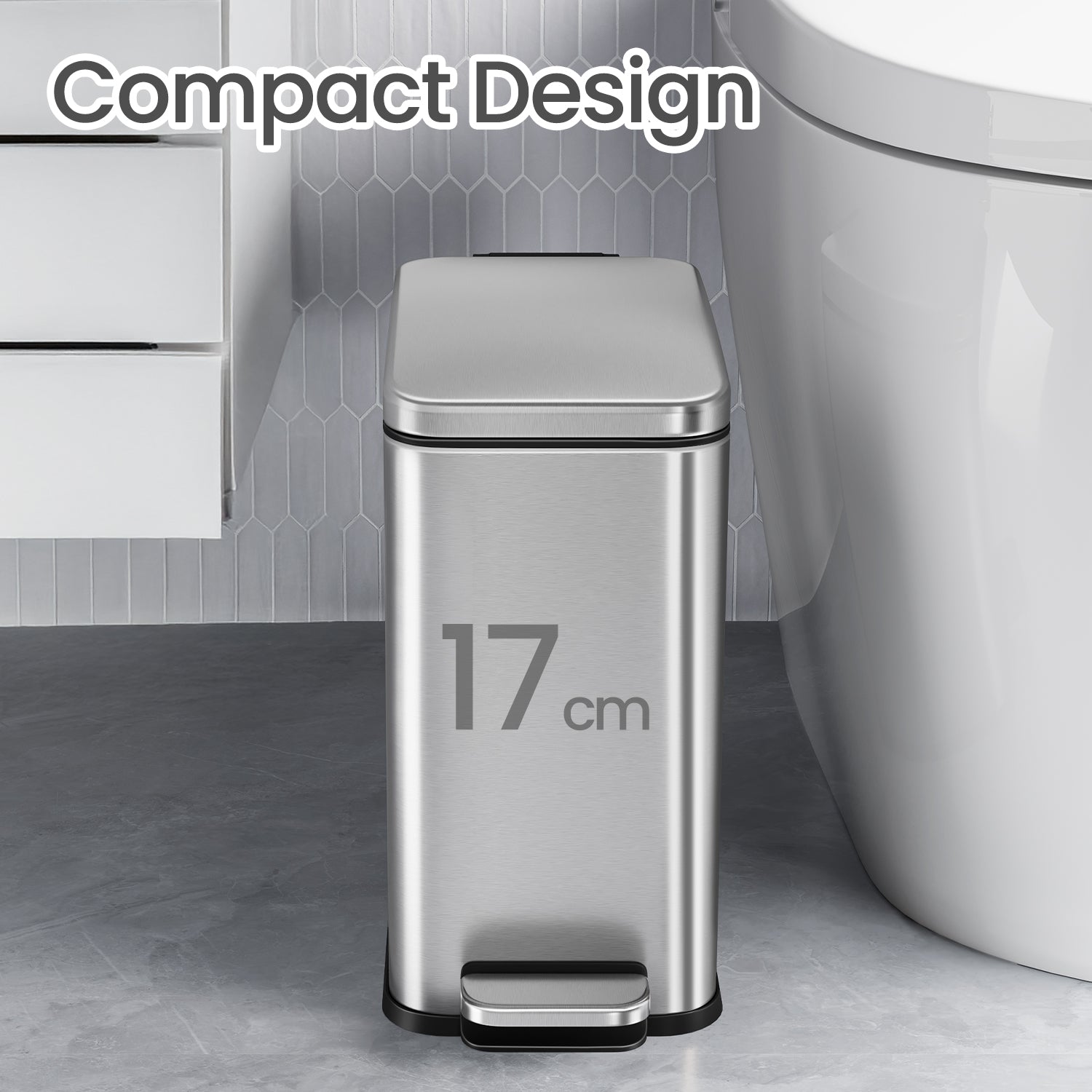Small Bathroom Trash Can with Lid 2.6 Gallon, Soft-Close, Step Pedal, Slim Space-Saving Design, Removable Bucket, Silver