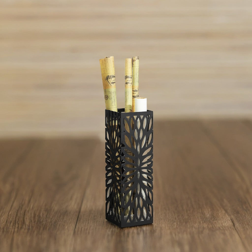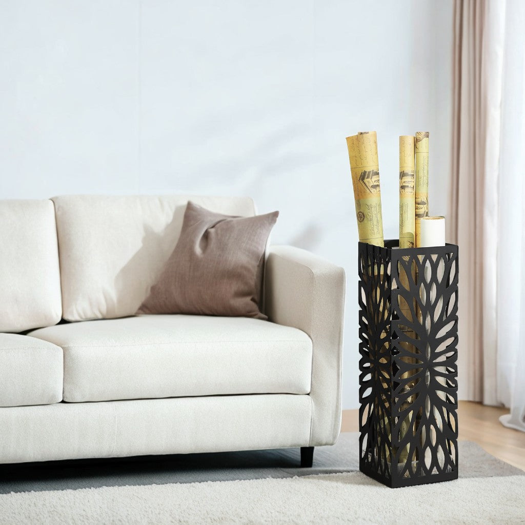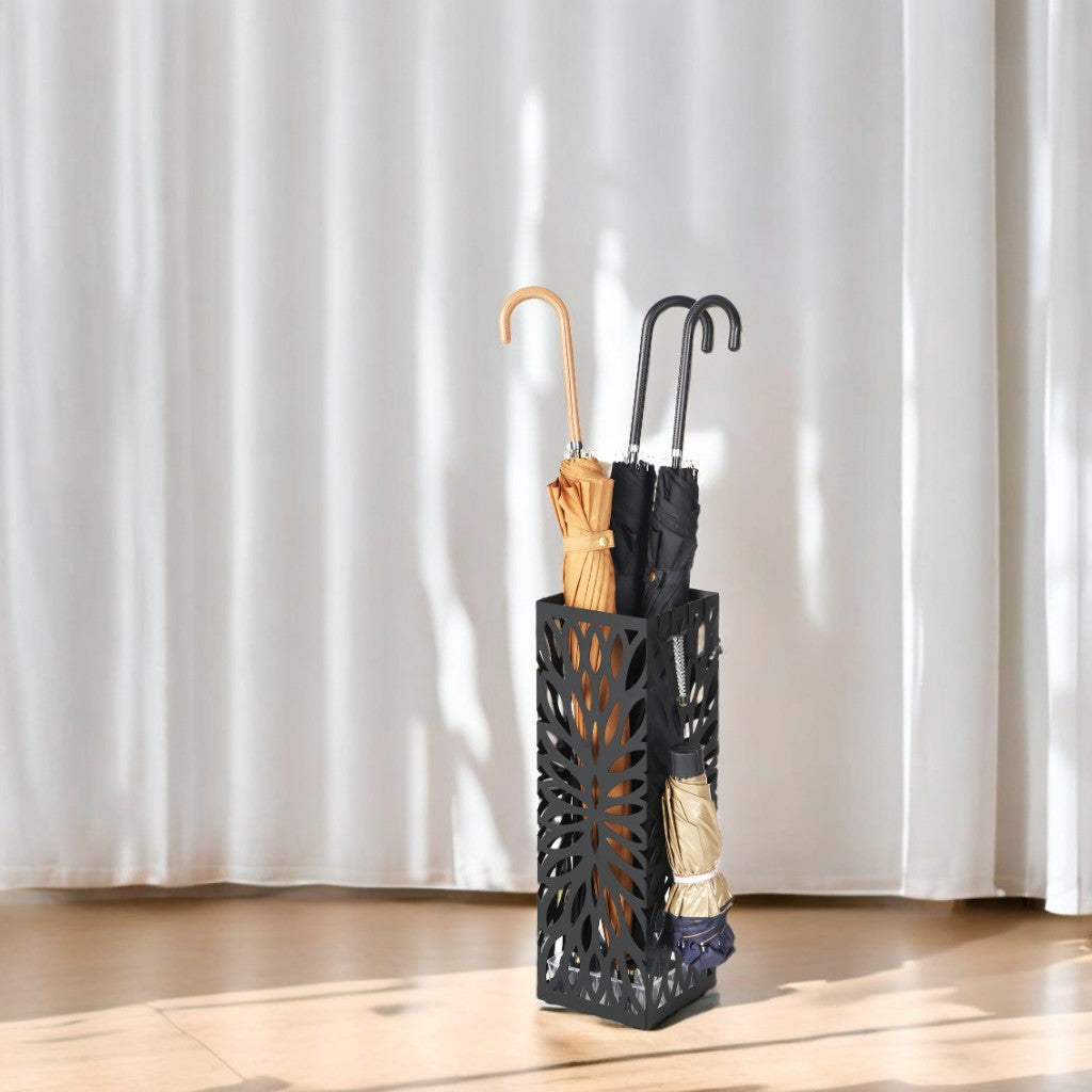 Square Umbrella Stand Organizer with Drip Tray, 4-Hook Steel Holder for Entryway Storage, Freestanding Design, Black
