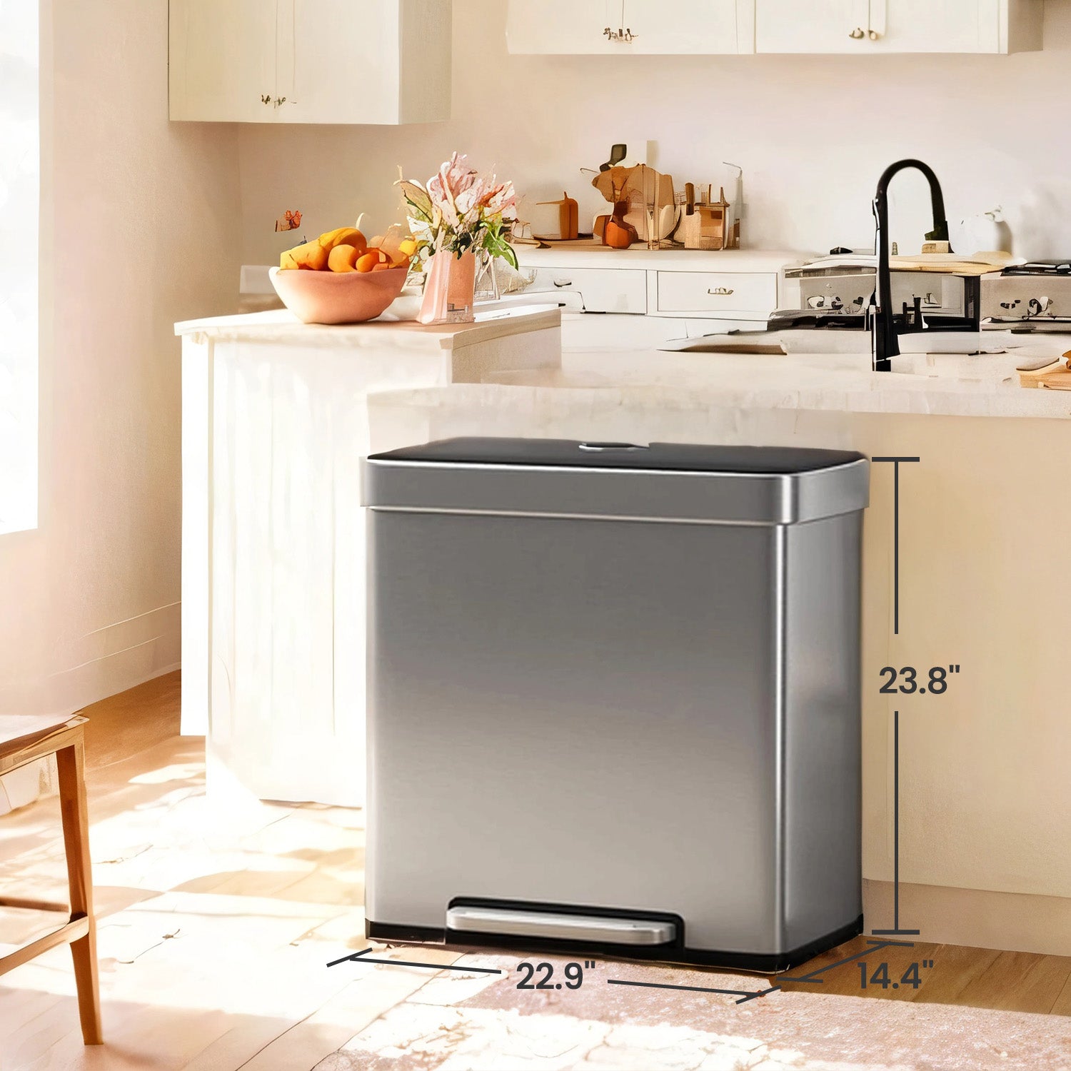 Stainless Steel 16 Gallon Dual Compartment Trash Can, 2 x 8 Gallon Pedal Bin with Stay-Open Lid & 15 Bags,Metallic Silver