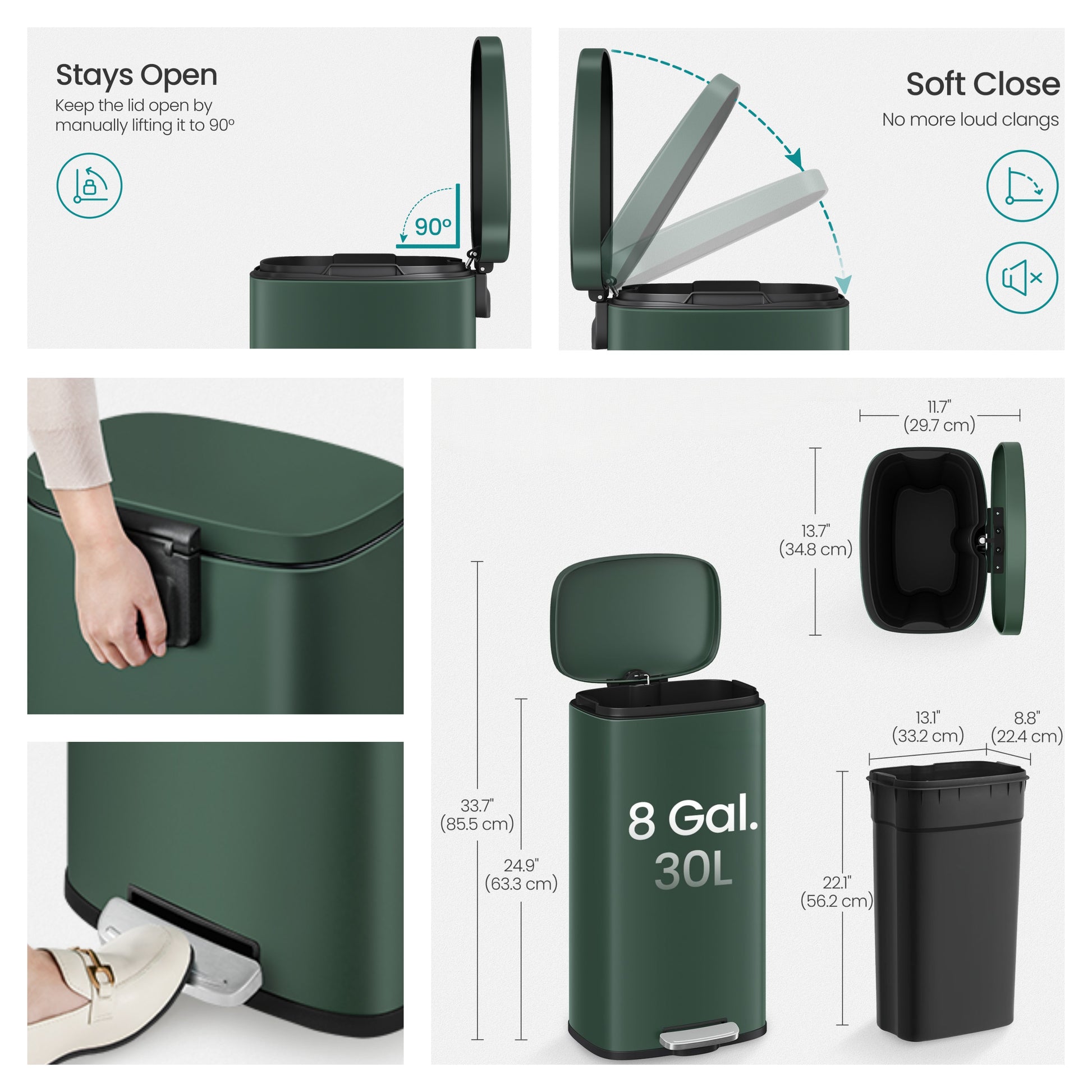 Stainless Steel 8 Gallon Trash Can with Step Pedal, Soft-Close Lid & Inner Bucket for Kitchen/Bathroom,Retro Green