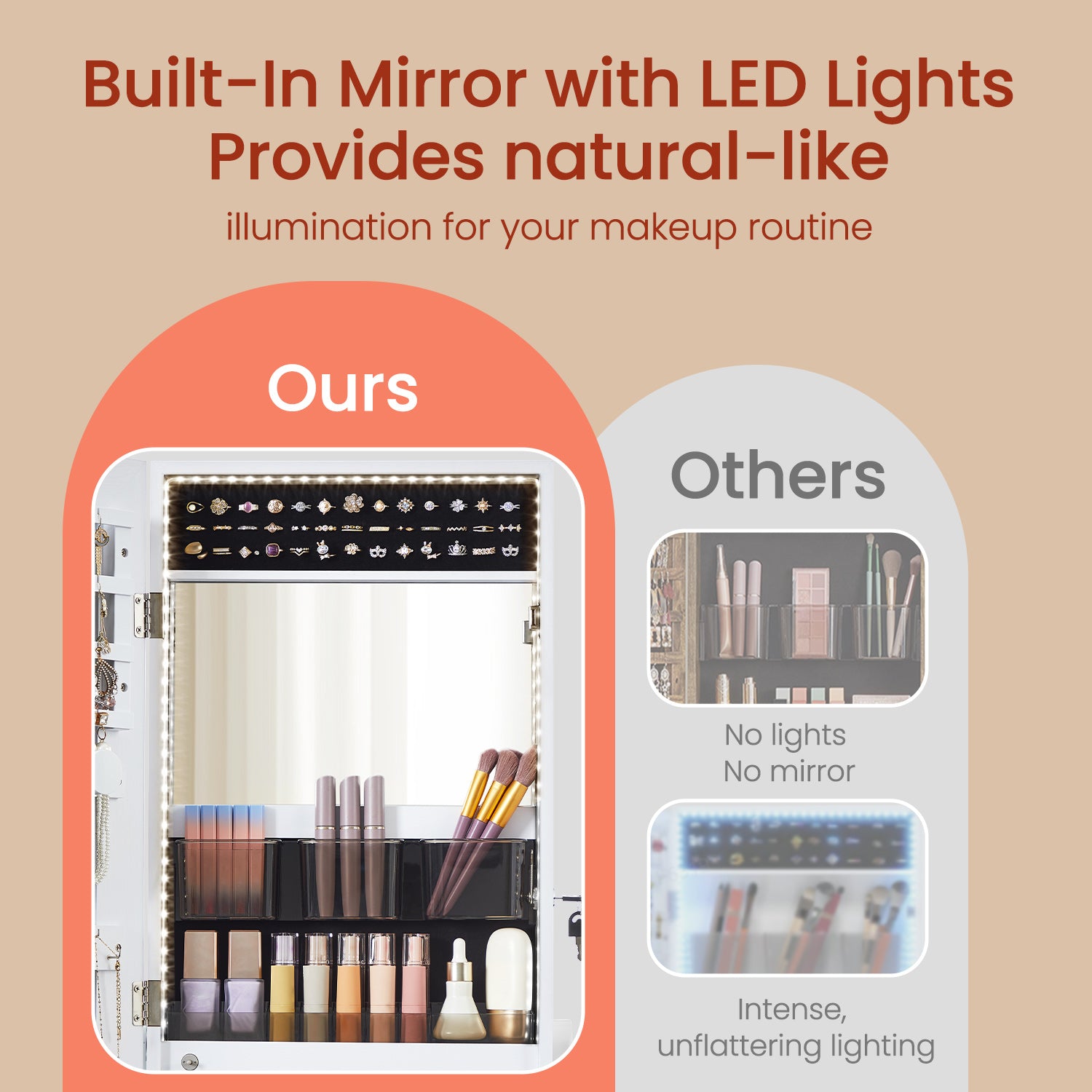 Standing Jewelry Cabinet with LED Mirror - Full-Length Organizer, 150+ Storage Slots, 2 Lockable Drawers, Freestanding Vanity, White