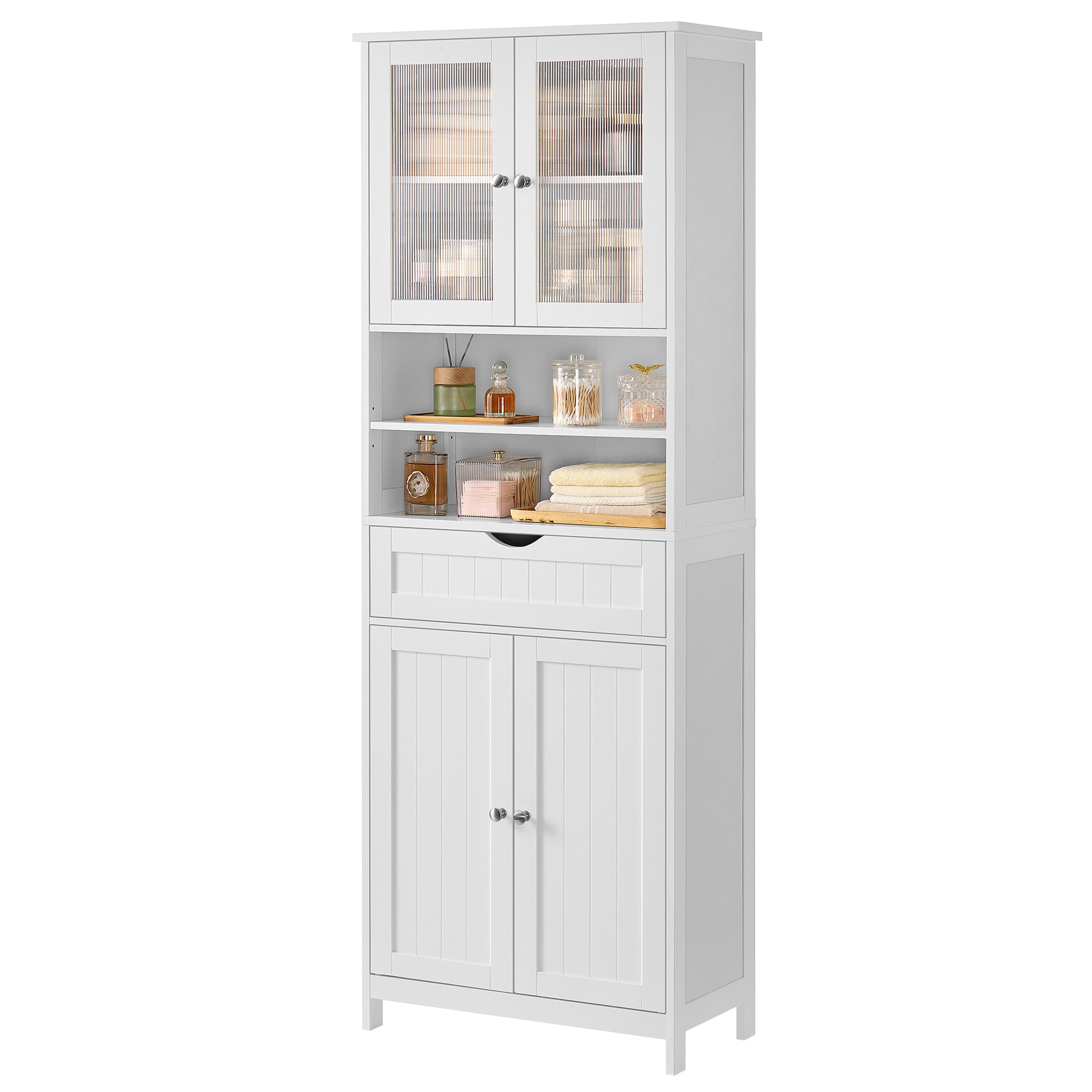 Elevate your home organization with this stylish freestanding storage cabinet, designed for both functionality and aesthetic appeal. Featuring two enclosed cabinets with acrylic doors, two open compartments, and a spacious drawer, it provides versatile storage for bathrooms, kitchens, hallways, or laundry rooms. Adjustable shelves accommodate items of varying sizes, while the premium MDF construction ensures durability and easy cleaning. The included anti-tip kit adds stability and safety, making this tall floor cabinet a secure and elegant solution to keep your space tidy and well-organized.