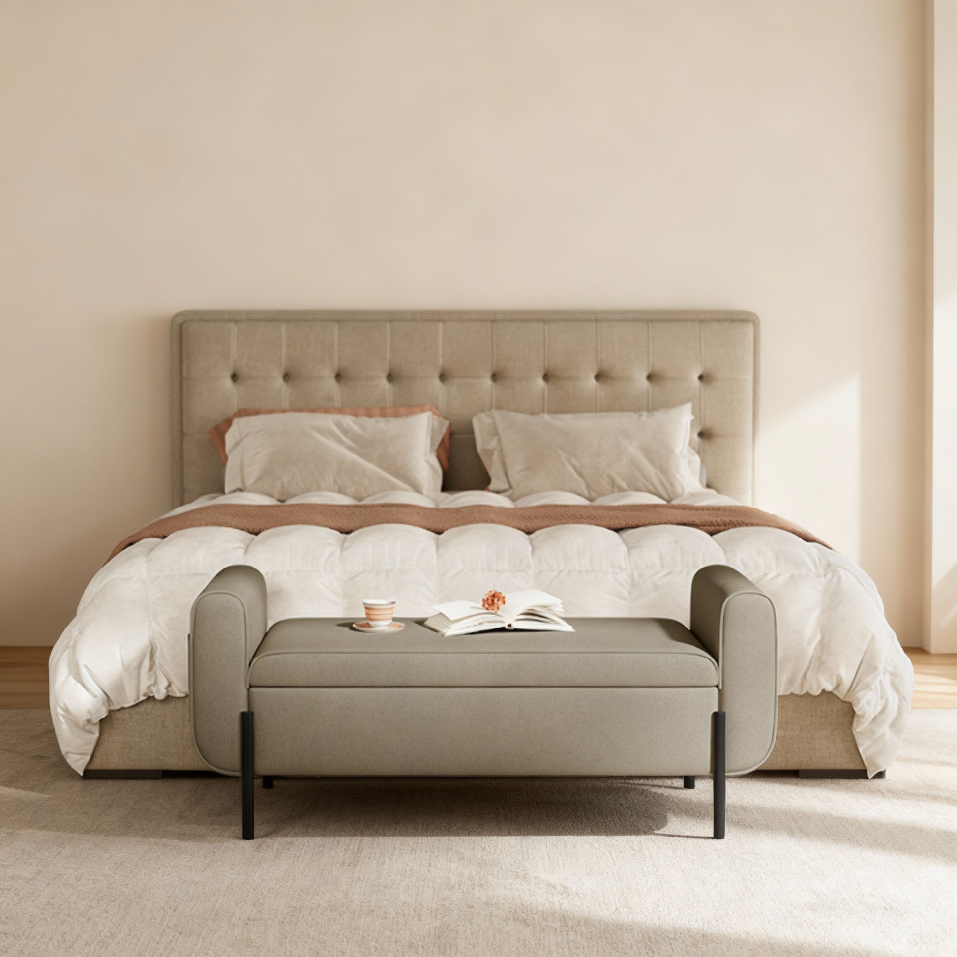 Enhance your living room, bedroom, or entryway with this stylish storage ottoman bench featuring armrests for added comfort. The bench is built on a sturdy solid wood frame with durable steel legs, supporting up to 660 lb, while the 1.6-inch high-density foam cushion covered in breathable linen-look fabric provides a resilient, comfortable seat. Under the seat lies 20 gallons of storage space perfect for blankets, pillows, or books, complemented by side pockets to keep small items organized. The gas-dampened lid ensures smooth, safe opening and closing, while the sleek modern design fits seamlessly into any home decor. Perfect as an end-of-bed seat, a cozy window nook, or a functional entryway bench, this storage ottoman combines convenience, comfort, and elegance in one.