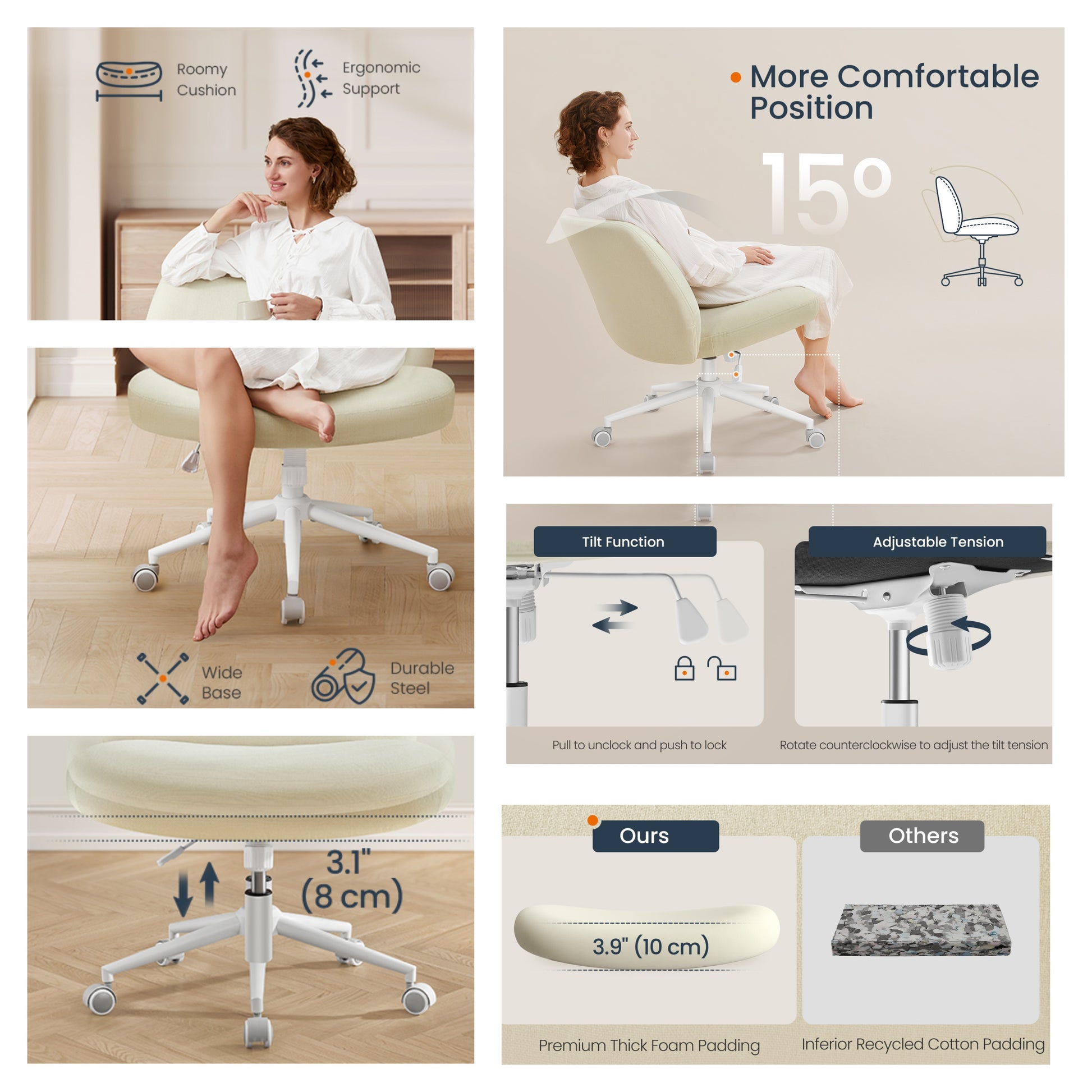Swivel Office Chair with Wheels, Armless Cross Legged Design, Adjustable Height & Tilt, Wide Seat for Home Office Desk, Cream White