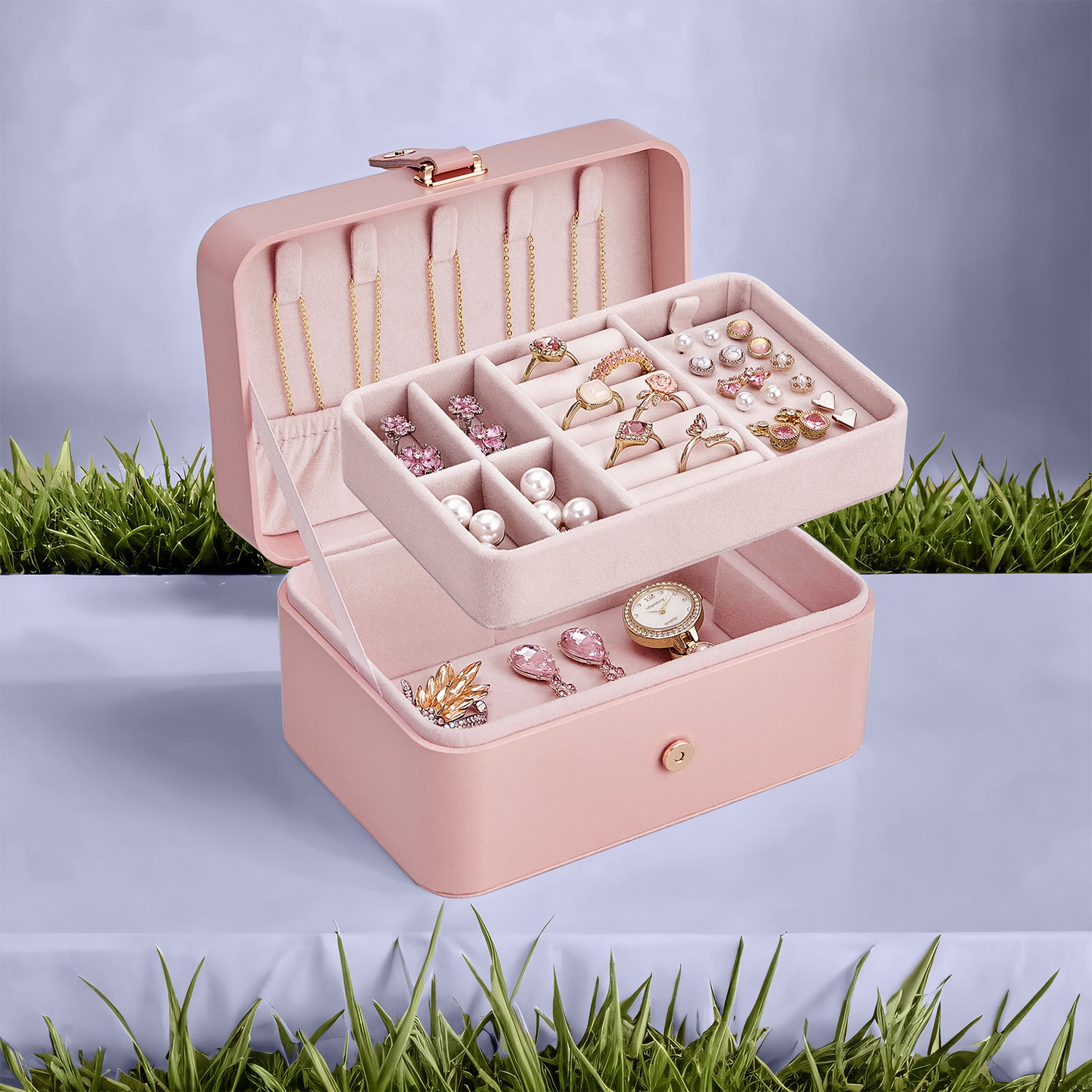 Travel Jewelry Organizer Box, 2-Tier Portable Jewelry Case with Removable Tray & Necklace Hooks, Compact Storage for Earrings, Rings, Bracelets & Large Accessories, Jelly Pink